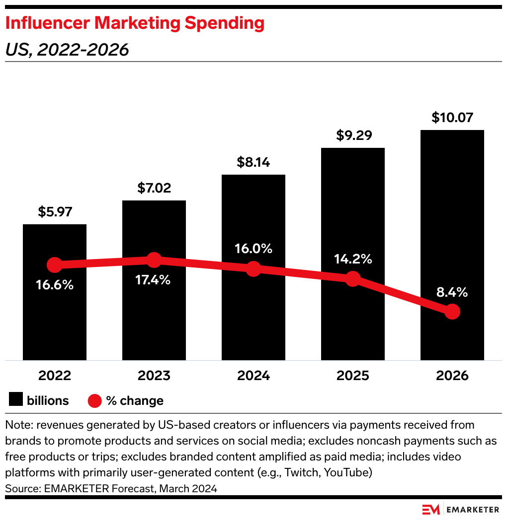 Zooming out: Influencer marketing has become a key component of the media mix, with US spending projected to reach $9.29 billion in 2025, a 14.2% YoY increase. This growth will outpace both digital and social ad spend growth, though influencer marketing will still account for a smaller share of overall marketing budgets.