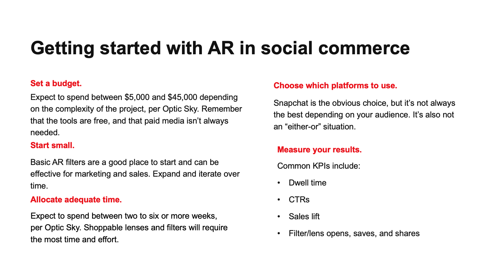 Marketers can use social AR tools to create their own filters, effects, or 3D experiences on social media. The more immersive the experience (including whether it has a direct shopping element), the more time, budget, and resources it will take.