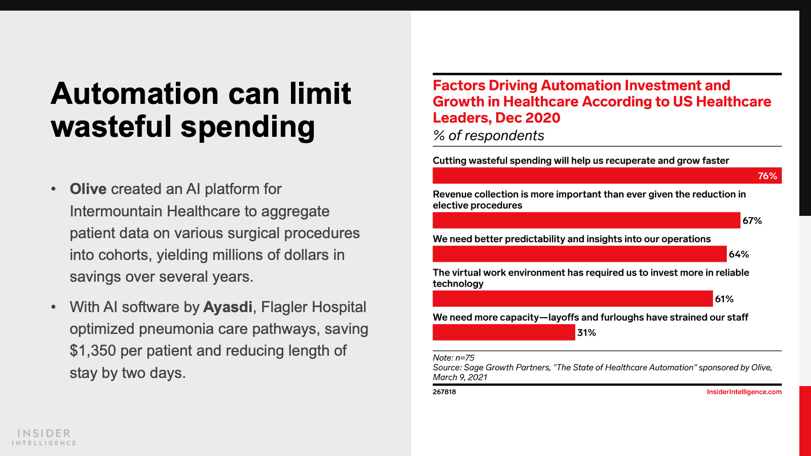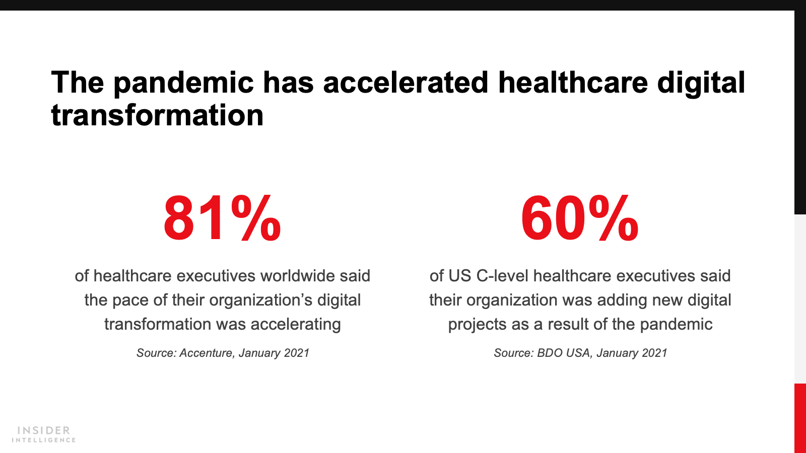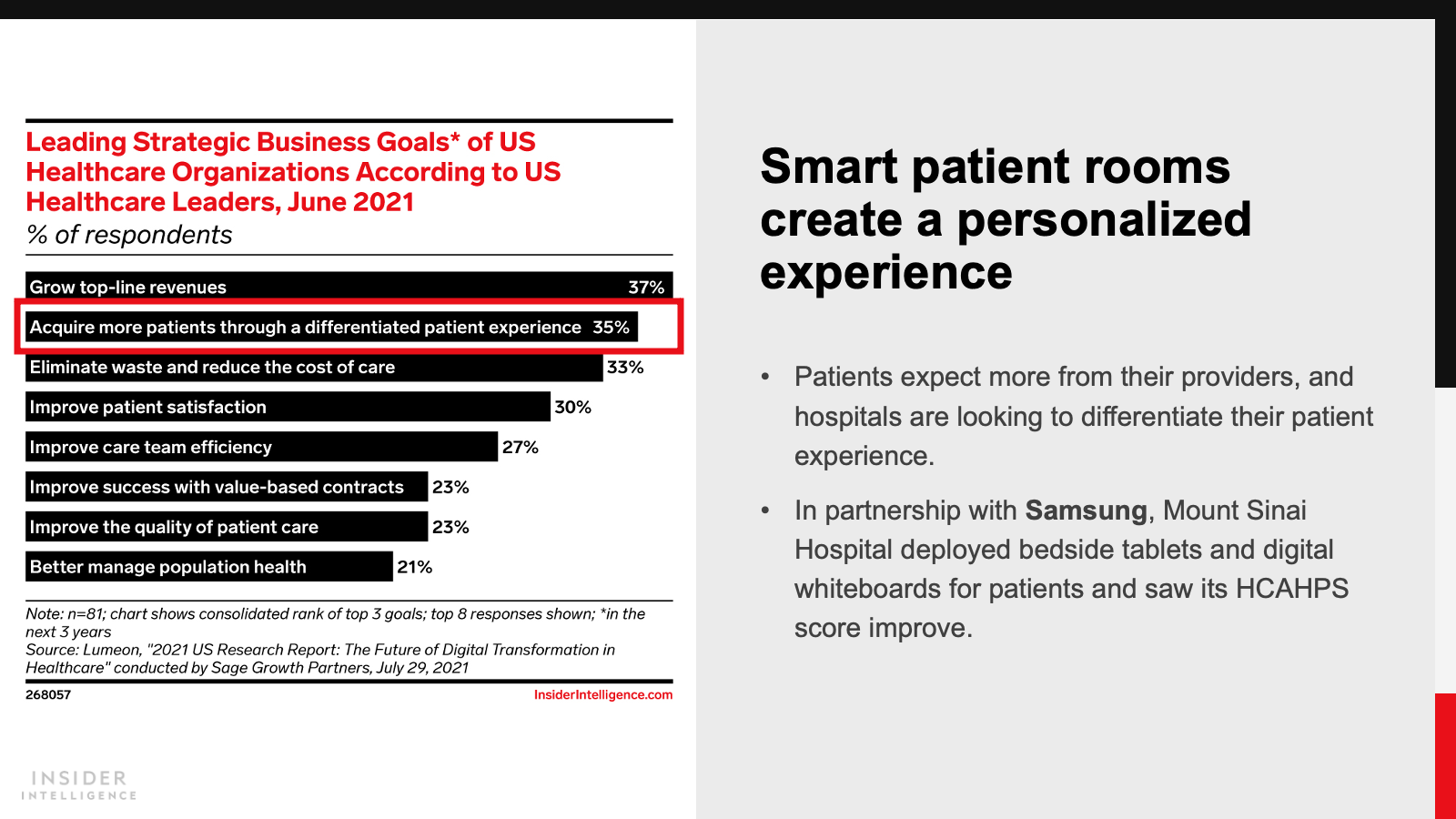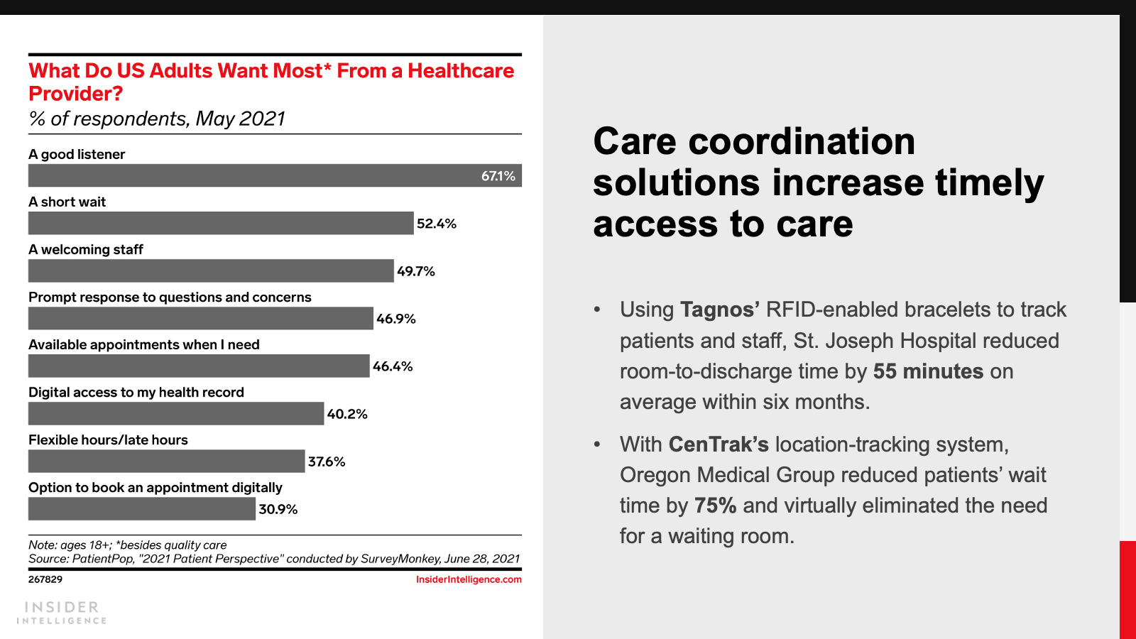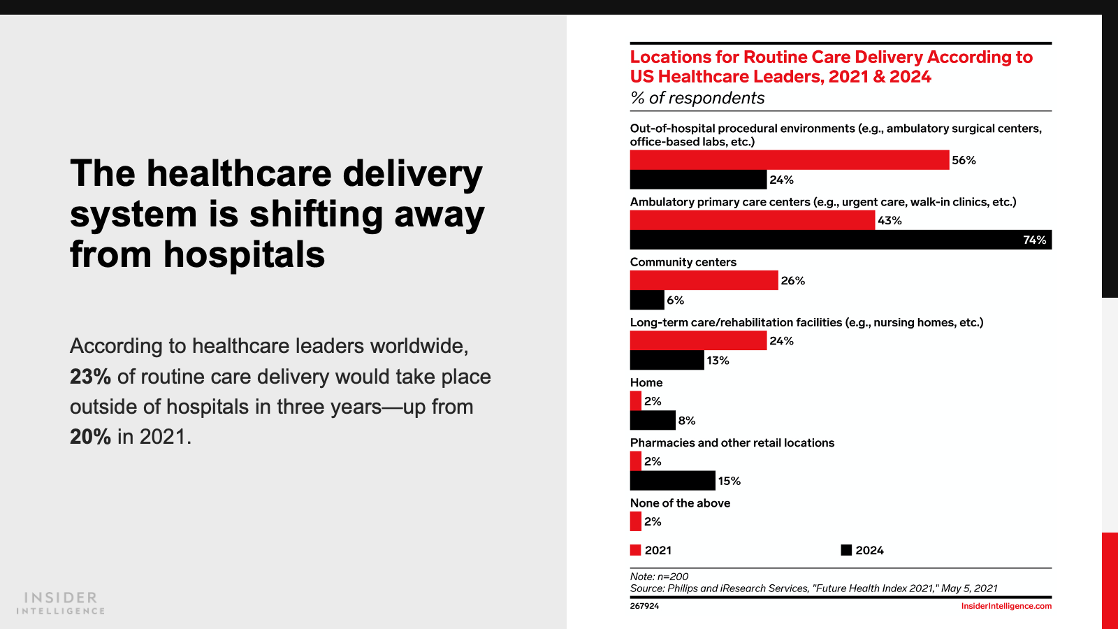 KEY STAT: Routine care is moving outside the hospital. Nearly three-quarters of US healthcare leaders expected ambulatory primary care centers to provide this care by 2024, versus 43% who said that was already the case, per a February 2021 Philips and iResearch Services study.