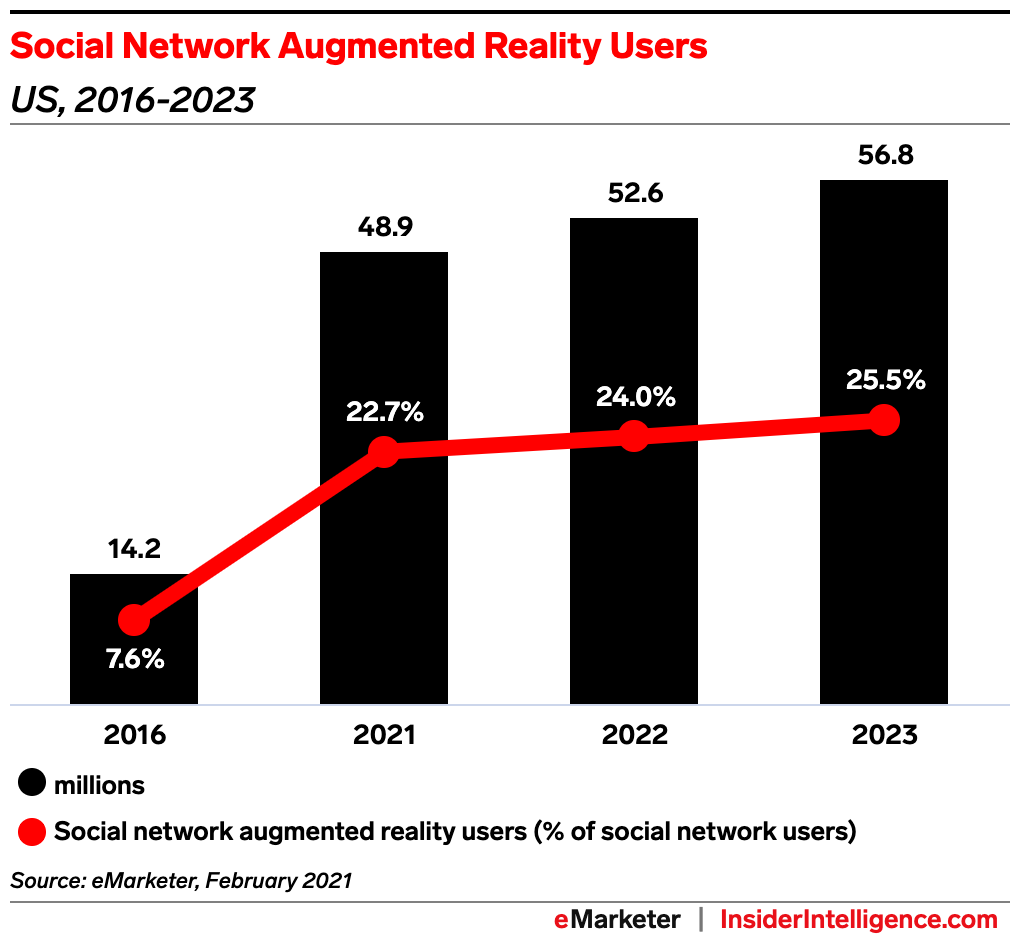 Key stat: When Snap launched the first version of its AR Spectacles back in 2016, just 7.6% of all US social media users (14.2 million) used AR, per our estimates. This year, we expect 22.7% of US social media users (48.9 million) to use AR.