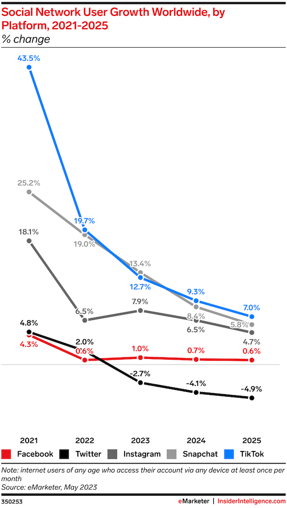 Key stat: With 13.4% YoY user growth in 2023, Snapchat will briefly overtake TikTok (12.7%) as the fastest-growing social media platform worldwide, according to our forecast. TikTok will regain the title come 2024.