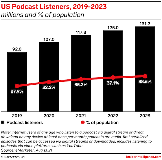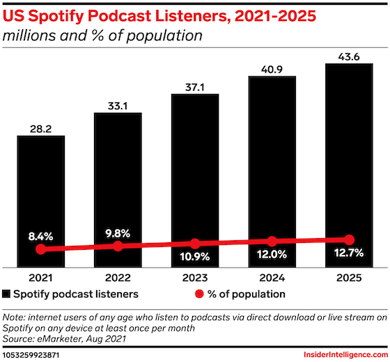 Looking ahead: In 2024, podcasts will reach about 40% of the population and 45% of internet users in the US at least once a month. By the end of the following year, there will be 142.7 million monthly podcast listeners. Among them, 43.6 million will listen via Spotify and 29.1 million will listen via Apple Podcasts.