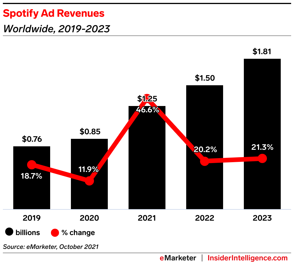 - As those metrics grow, so too will Spotify’s ad revenues: CEO Daniel Ek said he expects ads to make up at least a fifth (20%) of Spotify’s revenues soon, rising to 30% or even 40% over the next 10 years.