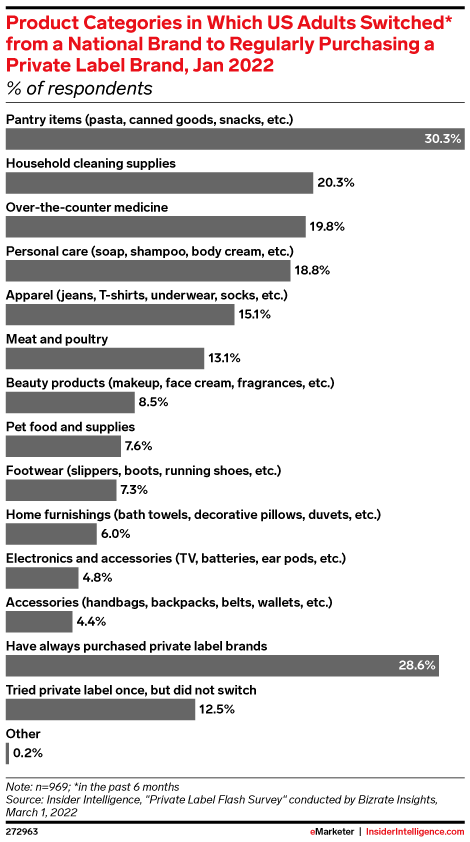 KEY STAT: US consumers have recently switched to—and stuck with—private label brands across a variety of product categories, from consumer packaged goods to apparel.