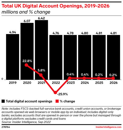 KEY STAT: Since 2019, total digital account openings surged by 30.0% to 6.4 million in 2021, and they’ll nosedive 25.9% in 2022 as the industry experiences a reset.