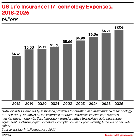KEY STAT: US life insurance IT/tech spending will rise to $5.66 billion in 2022, as companies push ahead with multiyear modernization initiatives while pursuing emerging opportunities.