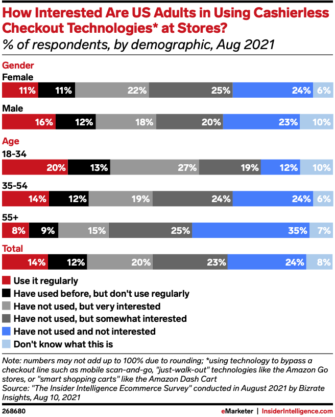 Twenty-six percent of US consumers have used some form of cashierless checkout technology, and 43% say they haven’t but are interested in using it, per an August 2021 Bizrate Insights survey.