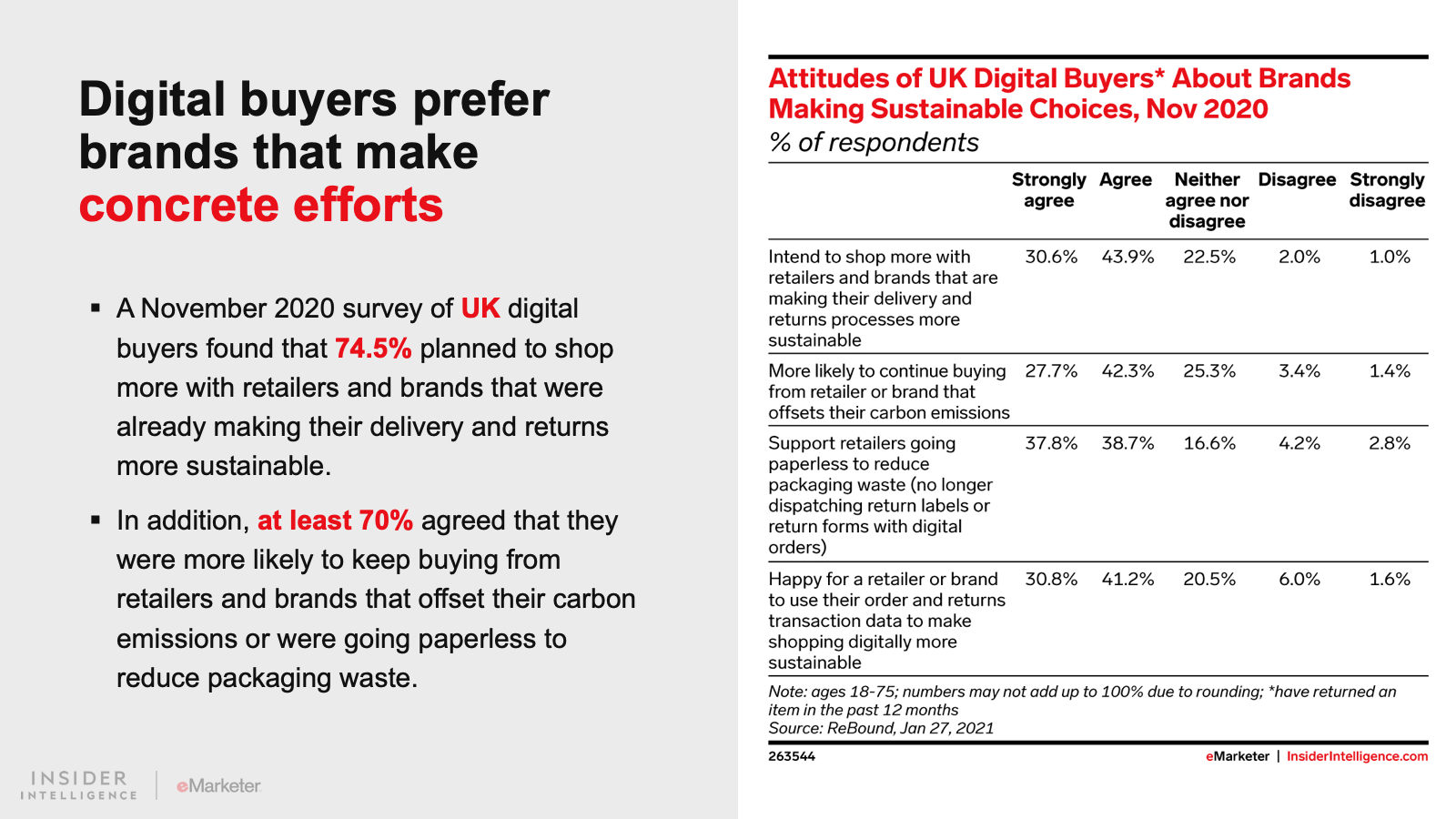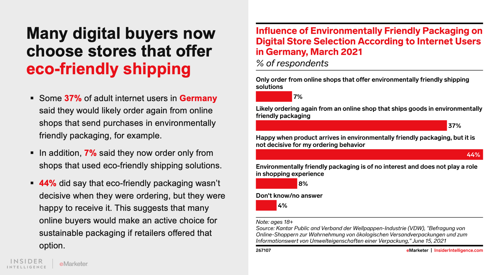 The pandemic generally increased consumers’ awareness of the environmental impacts of ecommerce; in 2021, many digital buyers are trying to choose eco-friendly brands. They expect brands and retailers to make packaging and deliveries more sustainable.