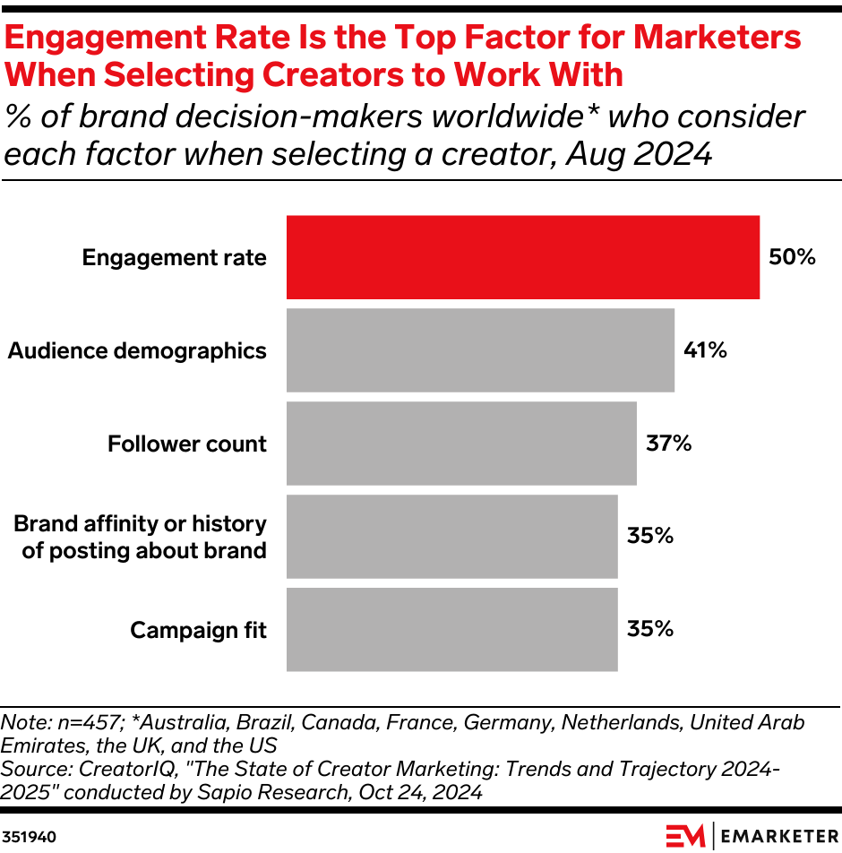 Key Stat: Half of marketers consider engagement rates when choosing creators to work with, significantly more than the shares that consider factors such as follower counts and campaign fit.