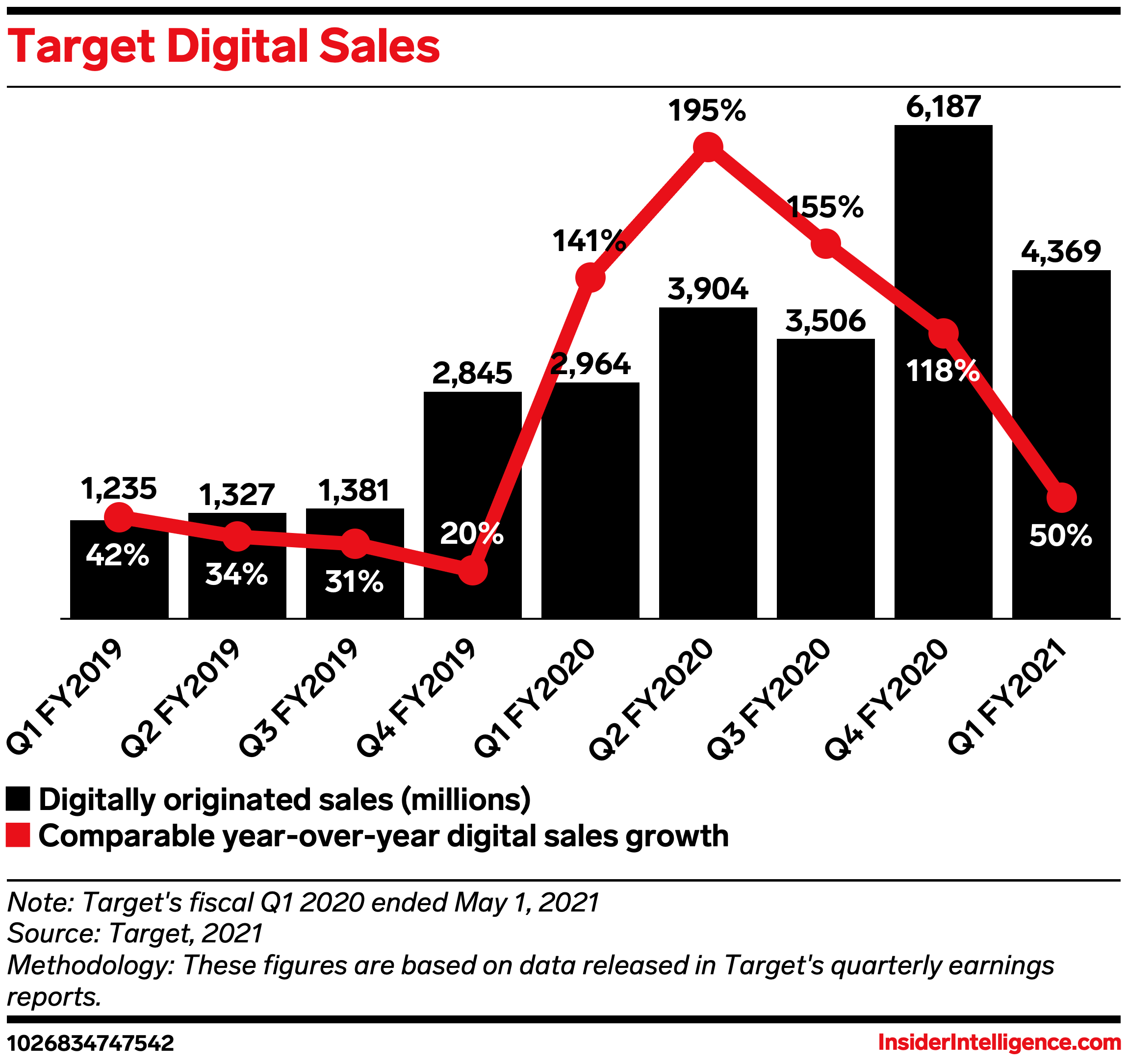 Target’s total comparable sales jumped 22.9% year over year (YoY) to $23.88 billion in its fiscal Q1 2021 (ended May 1, 2021)—accelerating from the prior quarter and the same period last year, when the metric grew 10.8% YoY. Meanwhile, the retailer’s digital comparable sales climbed 50% annually to $4.37 billion, a major slowdown from Q4 2020 (peak holiday shopping season) as well as Q1 2020, when digital sales skyrocketed 141% YoY as consumers flocked online at the pandemic’s onset. Pandemic conditions also improved during this period compared with last year, which may account for the deceleration in Target’s same-day digital services (order pickup, Shipt, and curbside pickup): The metric grew 90% YoY in Q1 2021, down from the 278% surge it posted last year.