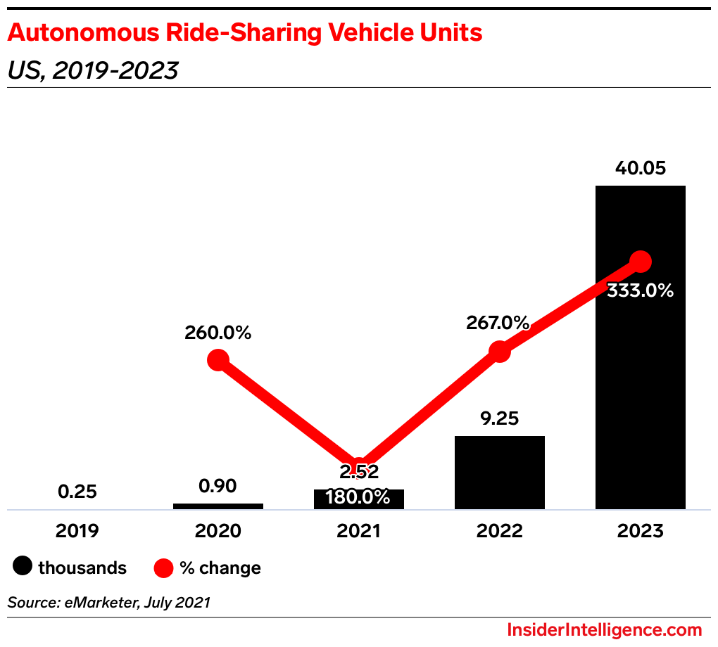 For context, Waymo’s robotaxis are driving 25,000 miles each day, per TechCrunch. Waymo and its rival Cruise lead the robotaxis segment and together drove 1.39 million miles in 2021—70% of the total autonomous drives for the year.