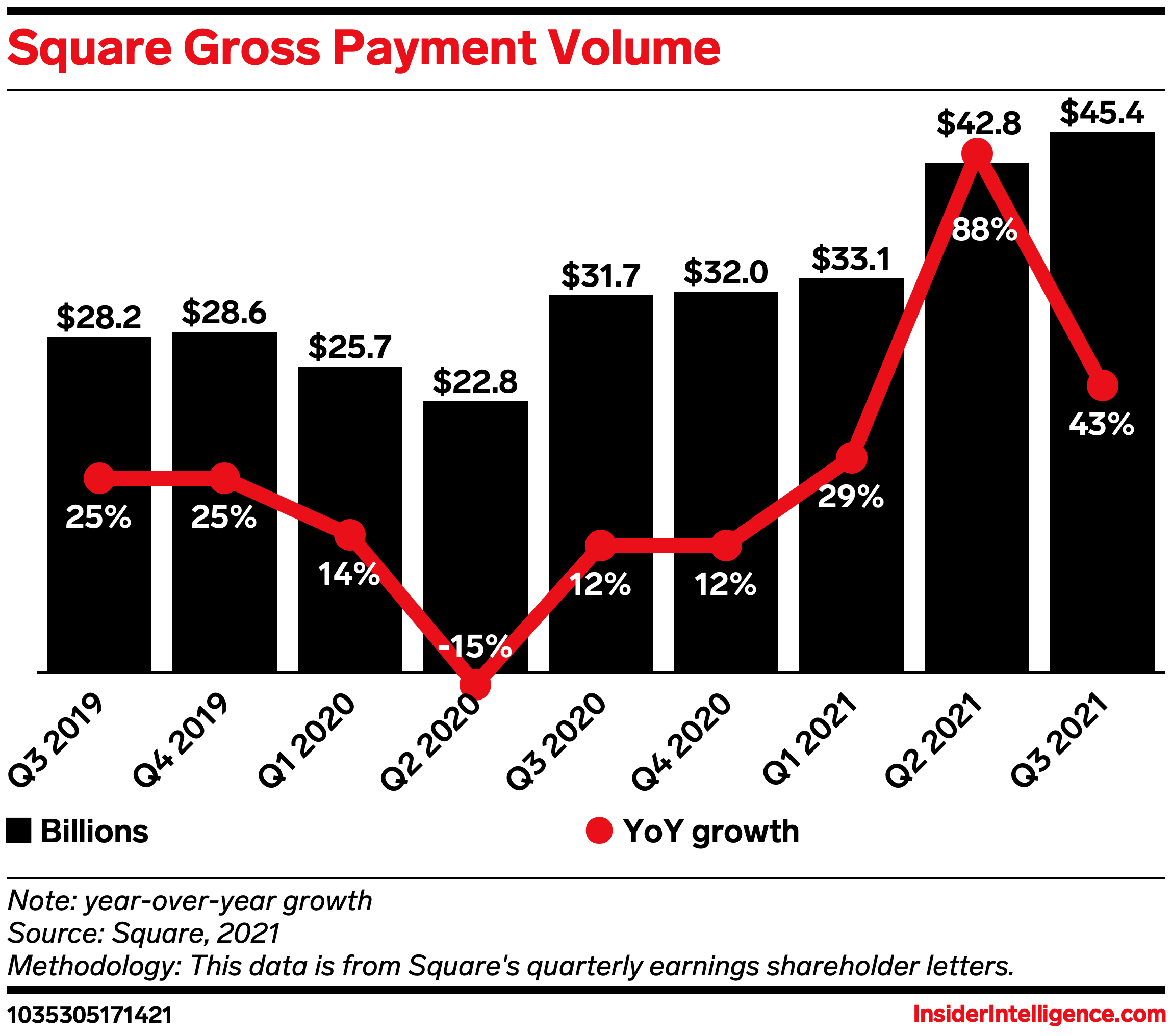 By the numbers: Square processed $45.4 billion in gross payment volume (GPV) in Q3, a 43% year-over-year (YoY) increase, per its Q3 shareholder letter.