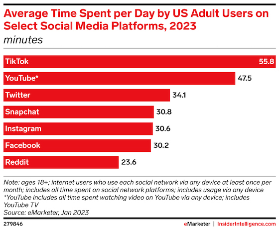 In the US, TikTok will capture the attention of its adult users for an average of 55.8 minutes a day, with YouTube close behind at 47.5 minutes, according to our forecast. At the other end of the spectrum, Facebook’s adult users will spend just over a half an hour per day on the platform, while those of Reddit will spend only 23.6 minutes with it.