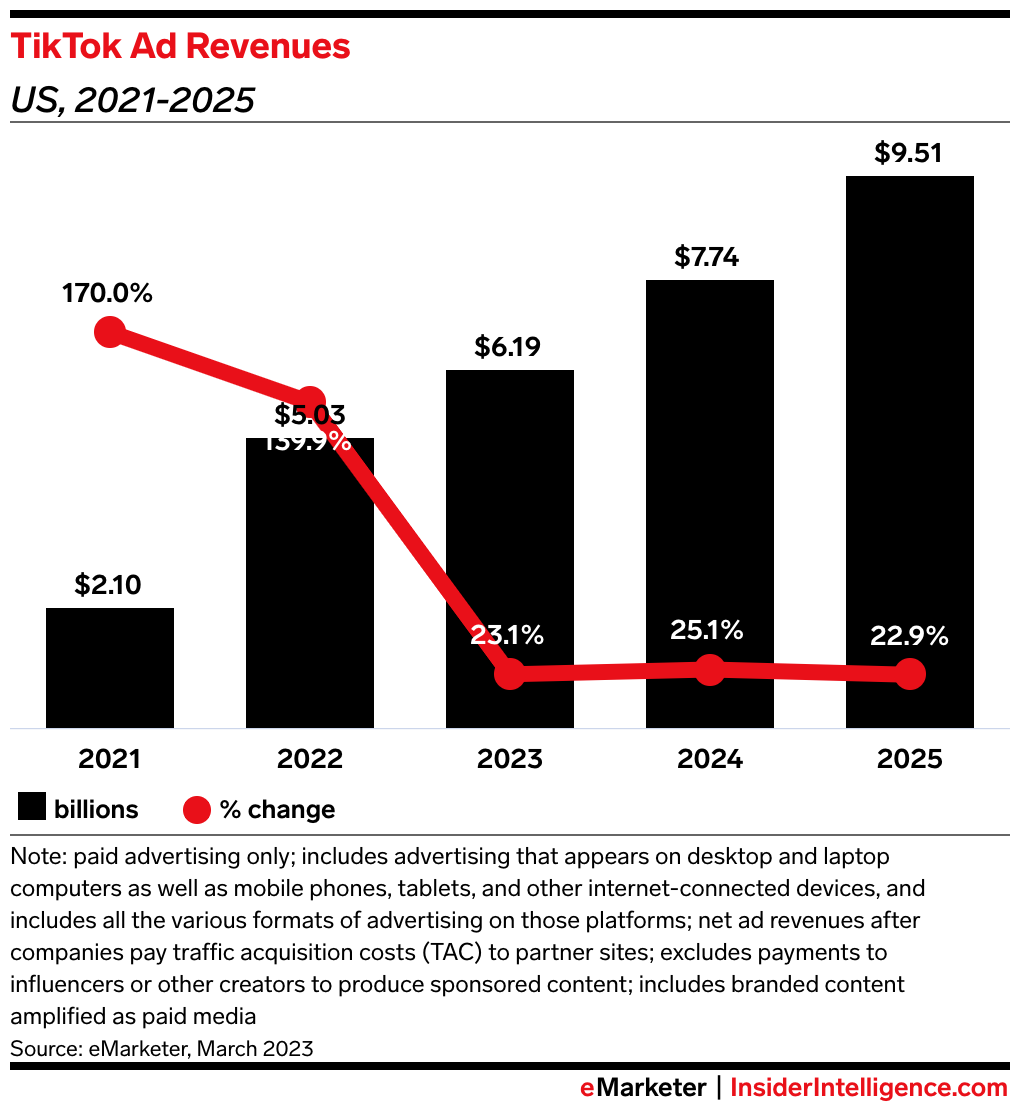 - Given those challenges, it seems far more likely that TikTok will eventually look for ways to continue building its advertising business. Our US TikTok forecast expects the company’s advertising revenues will grow over 23% this year.