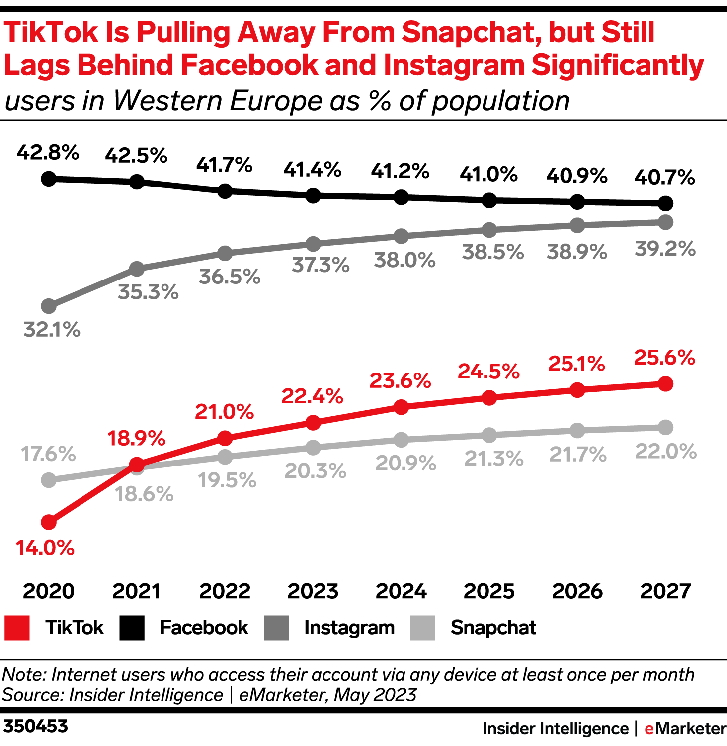 KEY STAT: TikTok users will account for 25% of the Western European population by 2026, but the platform will remain far less pervasive than Facebook and Instagram.