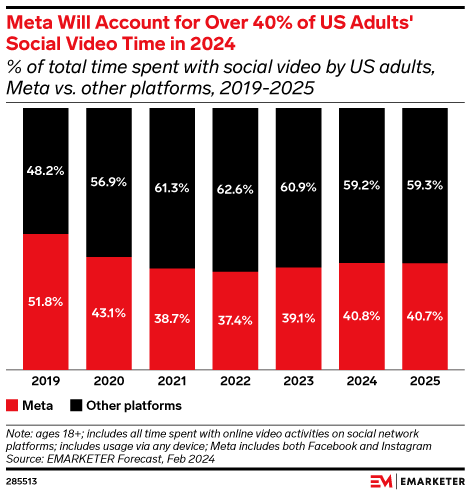 Social video is getting an additional boost in daily time spent this year. It’s mostly coming from a less expected place—Meta—even as TikTok continues to dominate in total time spent.