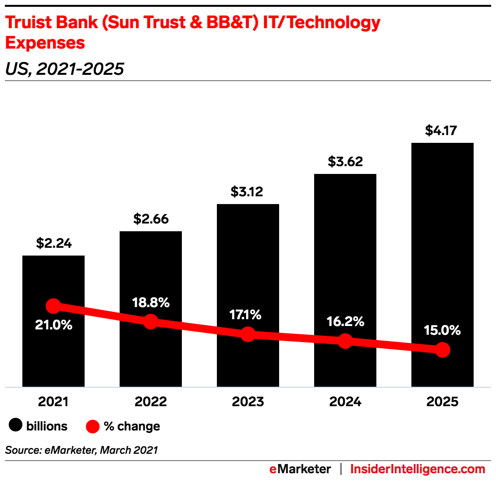 Limiting its presence in the physical channel while spending hard on digital is an ongoing theme in Truist’s strategy as it works to complete the SunTrust and BB&T combination. The bank estimates that it’ll spend a total of $2.1 billion on merger-related and restructuring charges through 2022, and it has incurred $1.3 billion of that total since February 2019. One place where those efforts could eventually yield savings for the organization is its branch footprint: Truist is working on a consolidation that will see a cumulative total of 800 branch closures by Q1 2022. So far, 374 of those closures have been completed, bringing Truist’s overall footprint to 2,556 branches as of the end of Q1. But as it draws down on its physical side, it’s bolstering its investments in tech: eMarketer projects that Truist will be the sixth-largest US spender on technology this year, with $2.24 billion in IT expenses, up 14% from last year.