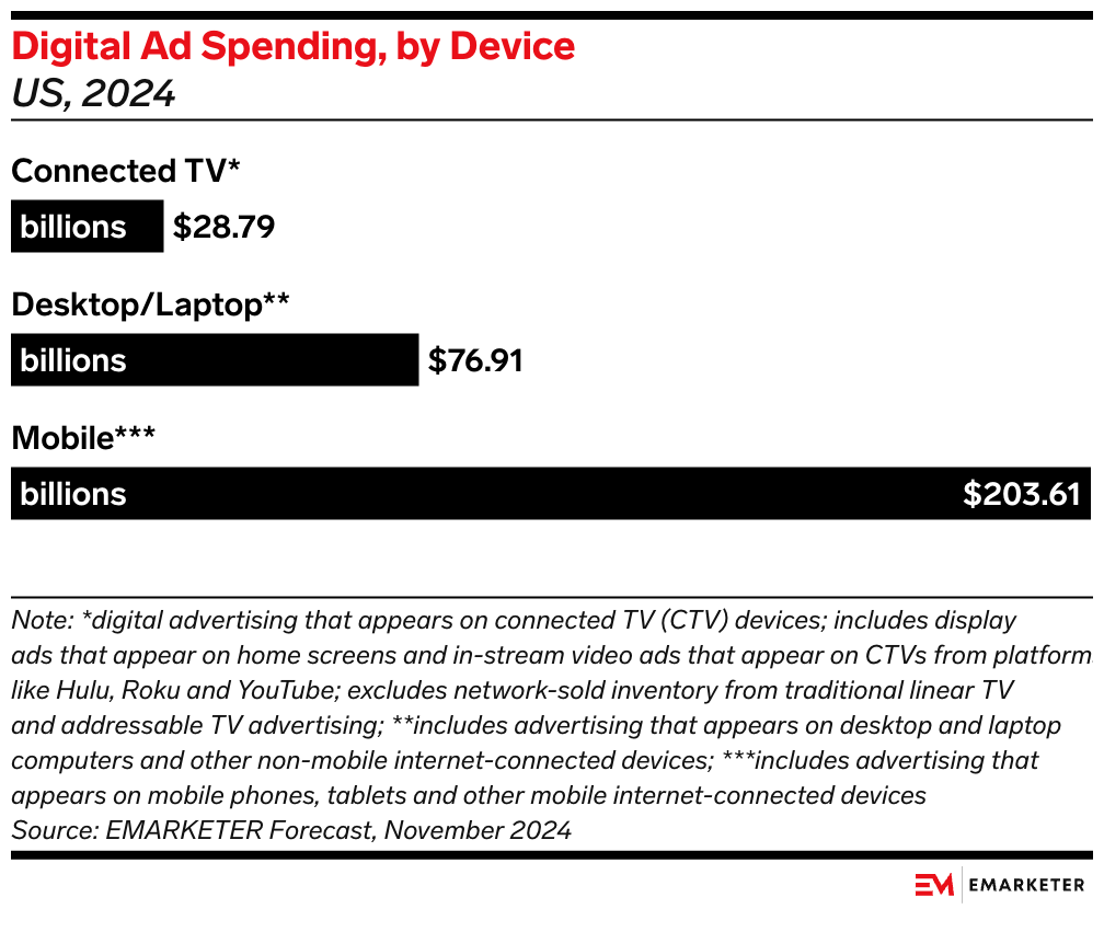 The news: Mobile ad spending will surpass $200 billion in 2024, reaching $203.61 billion, while desktop/laptop spending grows 11% to $76.91 billion, highlighting the widening gap between platforms.
