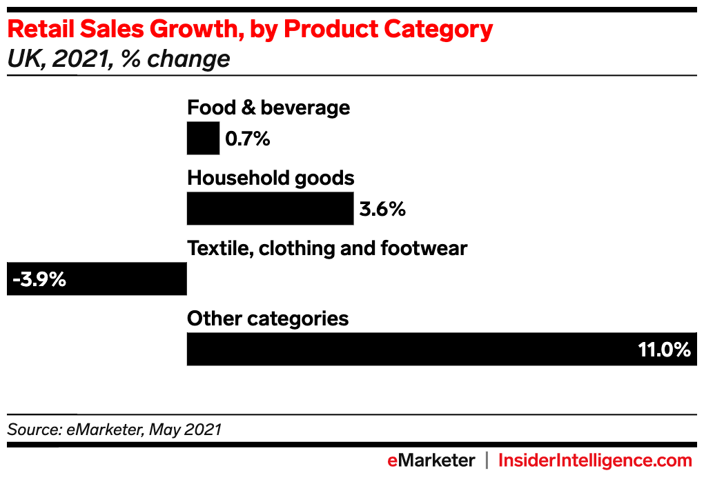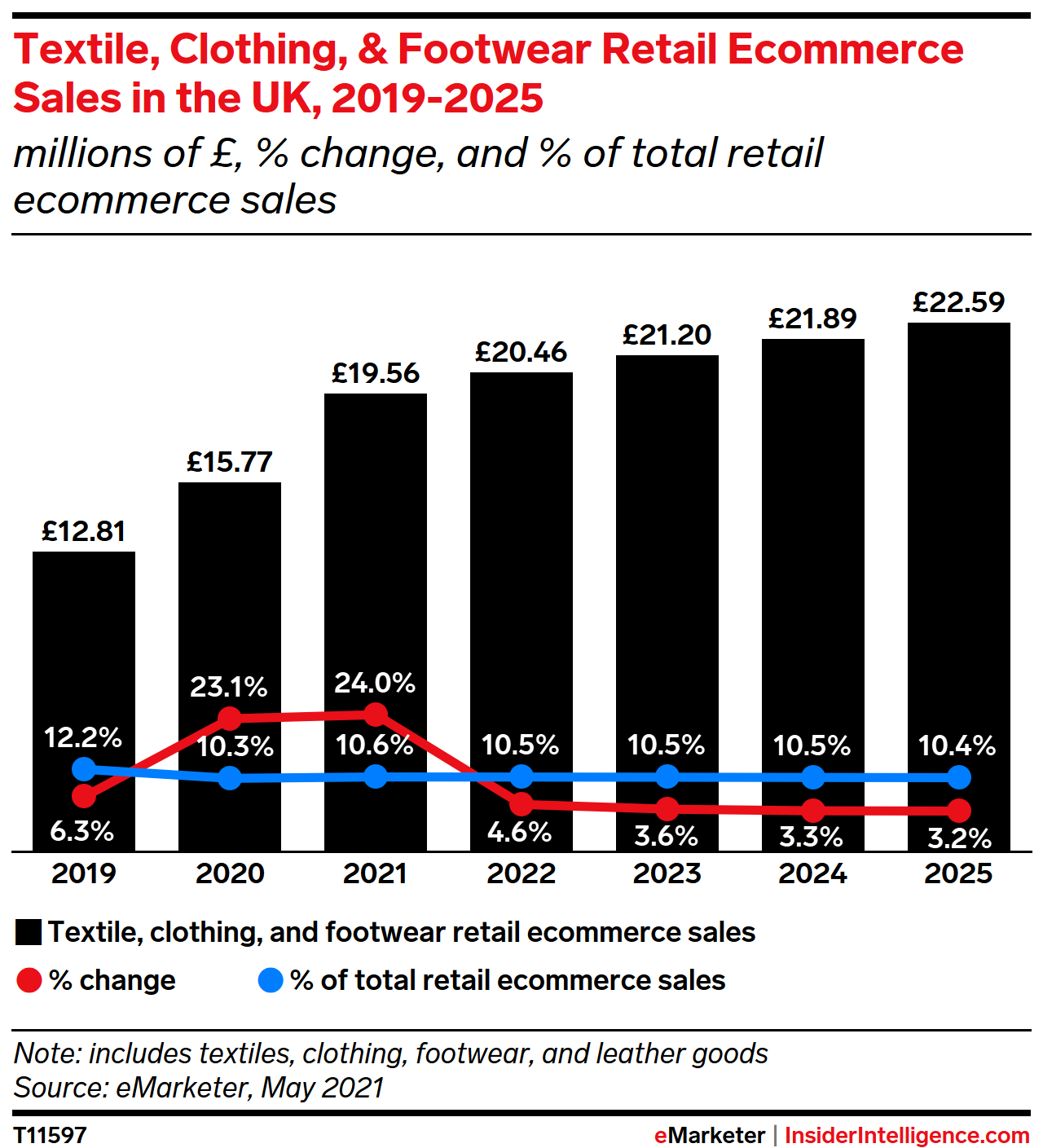 The forecast: During the pandemic-induced lockdowns in 2020, many UK-based shoppers confined to their homes saw little need to shop for apparel, and even now, as restrictions ease, apparel will still not be a consumer focus. We forecast textile, clothing, and footwear sales' proportion of total retail ecommerce sales will decline, as the sector fails to keep up with market growth.