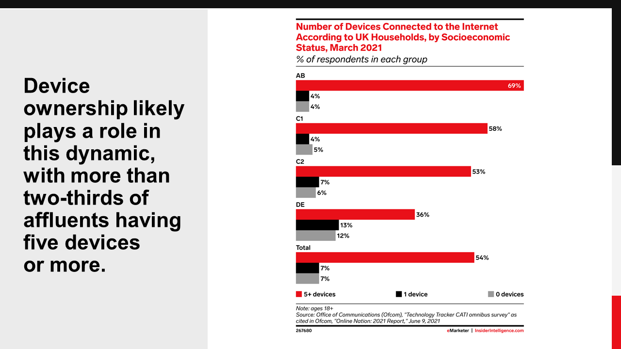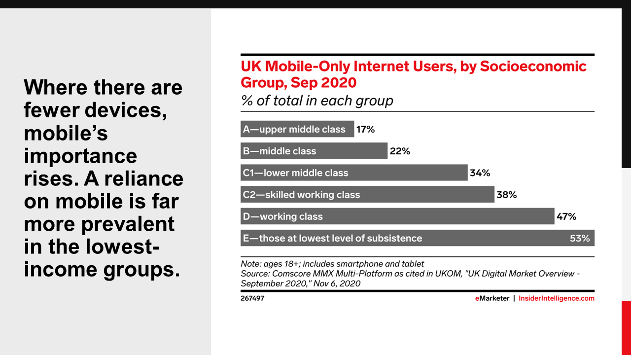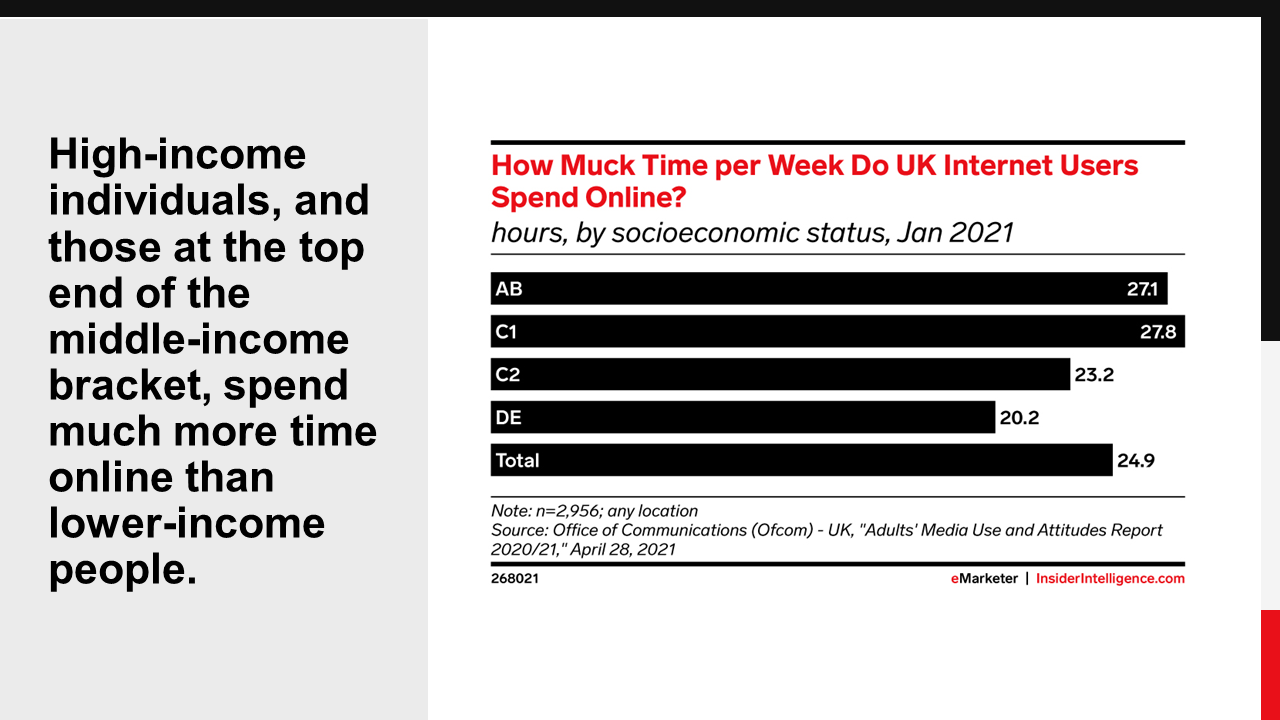 Higher-income individuals have more devices and tend to use them more. As a result, their time spent online outstrips that of low-income individuals. Those with fewer devices tend to rely on mobile as their main conduit to getting online. And while low-income individuals have tended to consume less digital media in general, the pandemic did give their time spent a bump.
