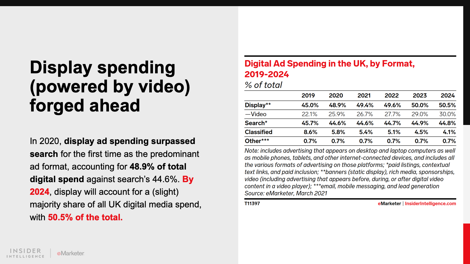Digital display advertising, and particularly video, benefited from the pandemic. Search, on the other hand, struggled as some of the largest budget holders were forced to pull back spend (travel, for example). This has led to Facebook gaining some ground on Google in terms of the duopoly’s ad revenue share. This year, Google will account for 39.6% of total digital ad spend, and Facebook will account for 28.9%. In 2019, those proportions stood at 40.1% and 24.9%, respectively.