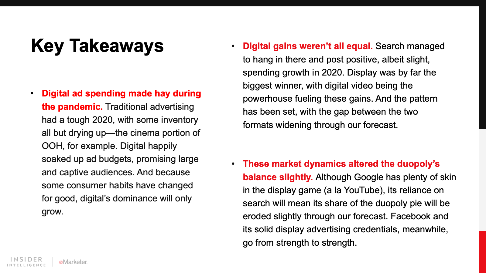 Some traditional formats—out-of-home (OOH), for example—will see a bounce back as pandemic restrictions ease, but none will see a return to pre-pandemic levels of spend anytime soon. Digital spending, meanwhile, was fueled in large part by video advertising. And with many digital consumer habits anticipated to stick post-pandemic, digital video is set to bolster its position as a key digital ad format for years to come.