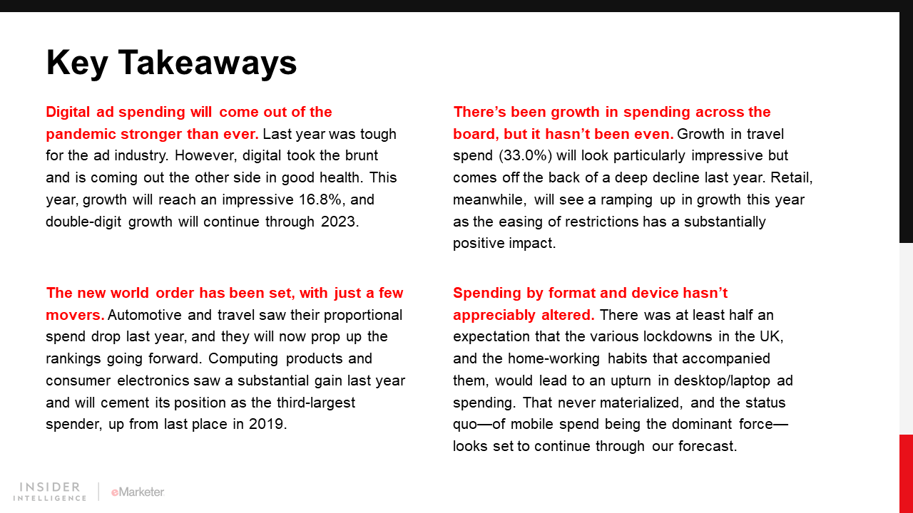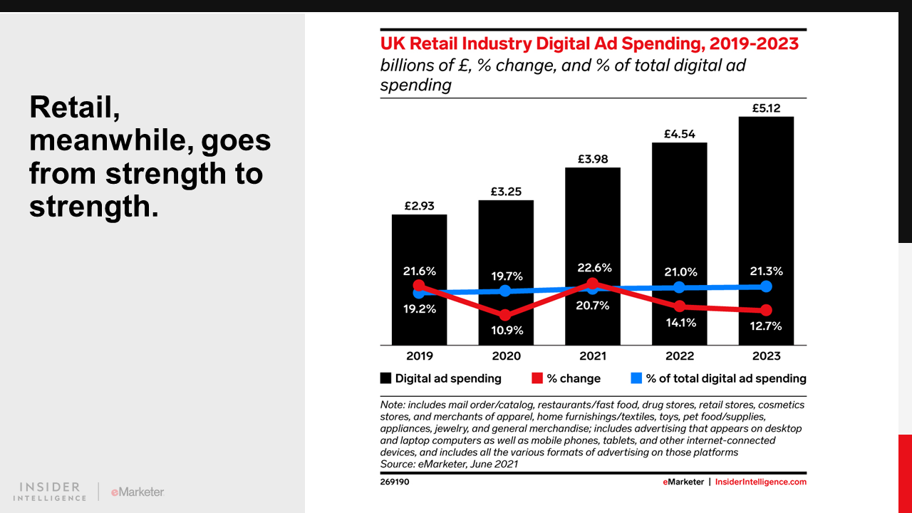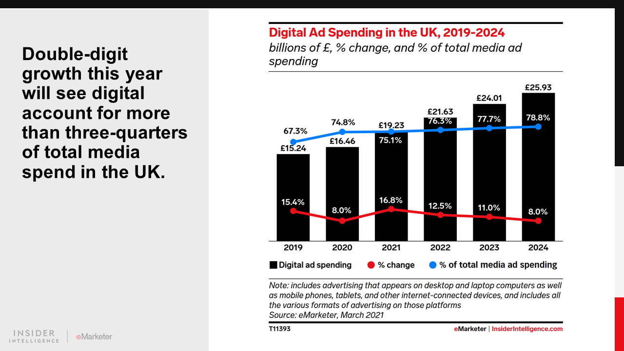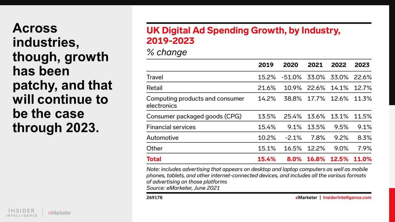 In 2021, UK digital ad spending will grow by 16.8% to £19.23 billion ($24.66 billion). Retail will contribute the most to that total as the pandemic recovery continues, but growth across all industries will be a feature this year.