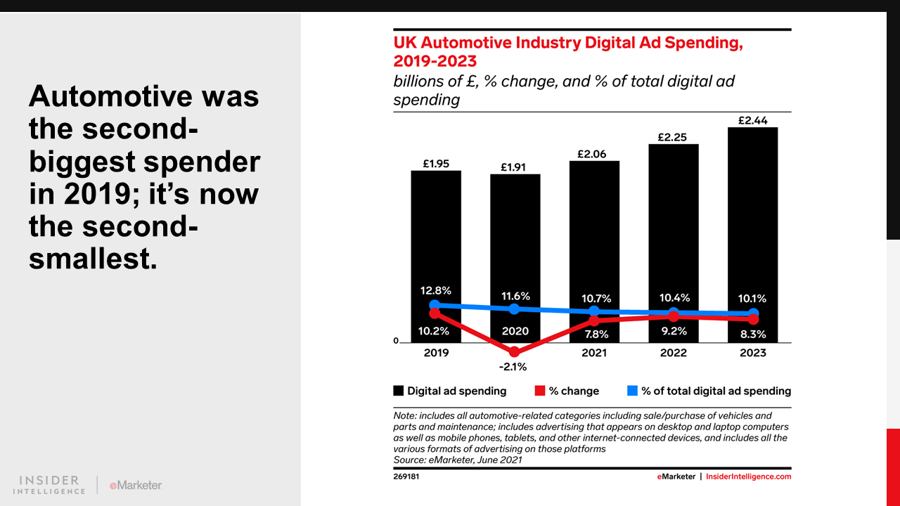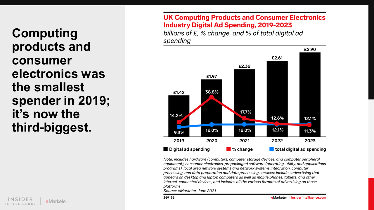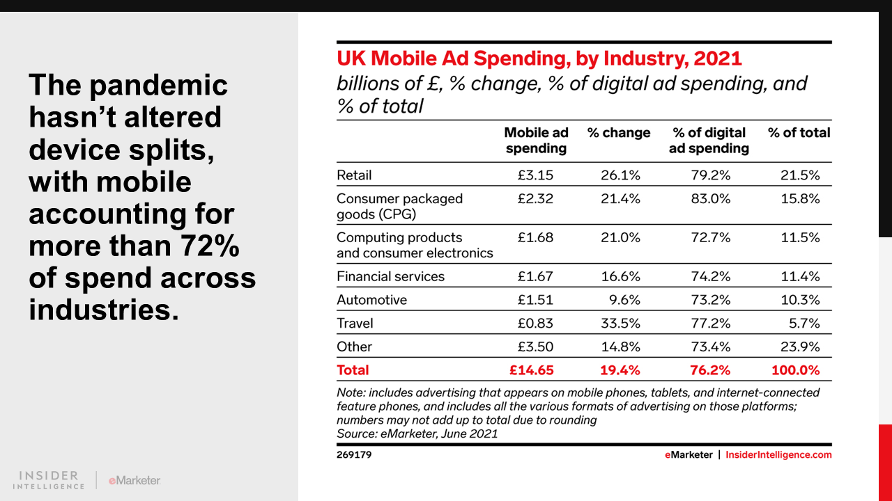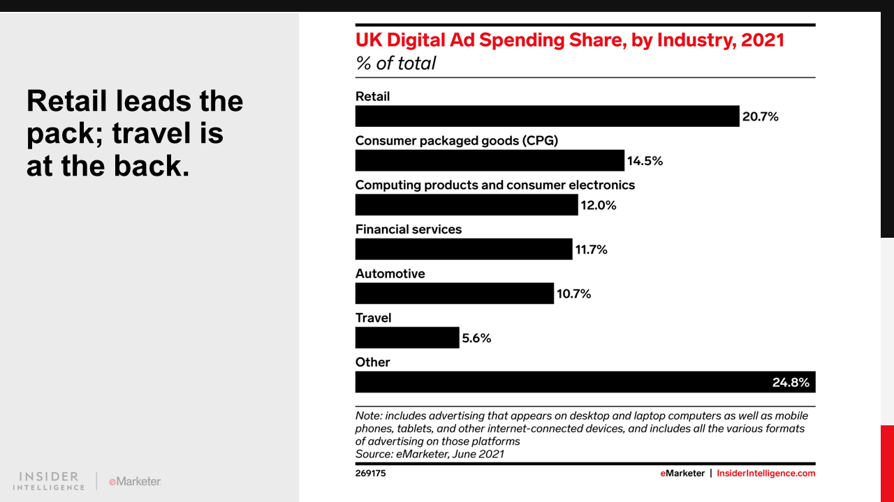 Retail will pull even further ahead of all other categories in 2021, spending £3.98 billion ($5.11 billion). The consumer packaged goods (CPG) industry is second, reaching £2.79 billion ($3.58 billion). Meanwhile despite some rebound from 2020, travel bottoms out the rankings with £1.07 billion ($1.38 billion) in spending.