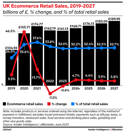 KEY STAT: After last year’s slump, UK ecommerce sales will dip further by 0.6% in 2023. That means ecommerce’s share of total retail sales will fall to 32.0% this year, compared with its peak of 37.6% in 2021.
