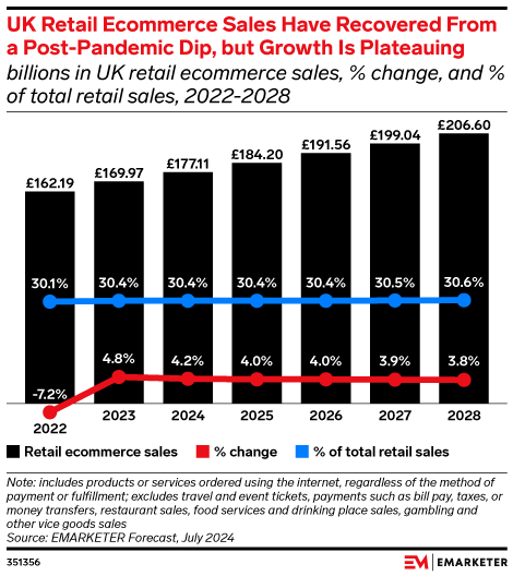 Key Stat: UK retail ecommerce sales will reach £177.11 billion ($220.22 billion) in 2024, their highest level since 2021. However, ecommerce penetration has plateaued at 30.4%.