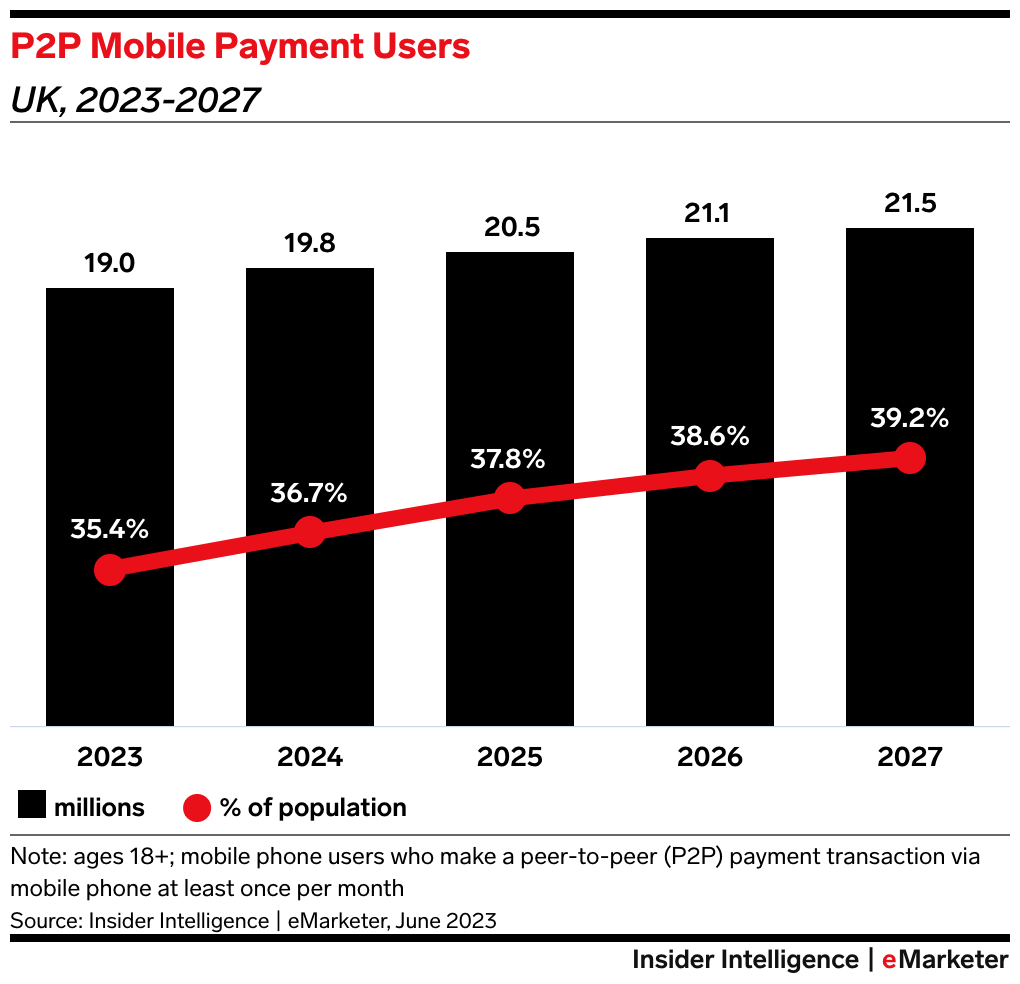 KEY STAT: UK mobile P2P payments need a boost: Annual user growth is expected to taper from 4.5% in 2023 to just 2.1% in 2027.