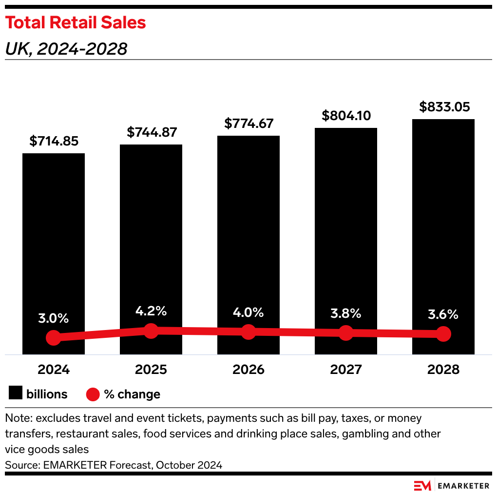 - The British Retail Consortium expects real sales to decline this year, as projected sales growth of 1.2% in 2025 is expected to trail the rate of inflation. While our forecast of 4.2% YoY growth is more optimistic, it was published before the release of the Labour budget.