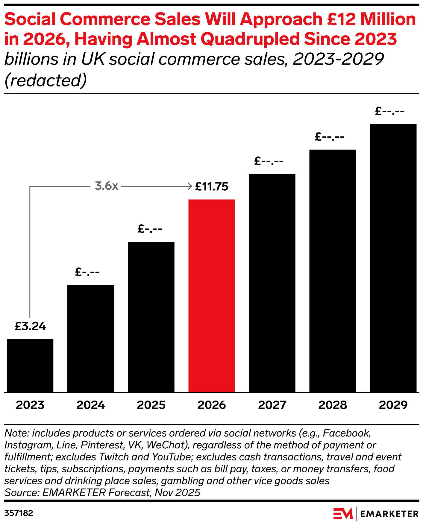 Key Stat: UK social commerce sales will reach £11.75 billion ($15.01 billion) in 2026. Double-digit growth will continue through 2029, when it will surpass £16 billion.