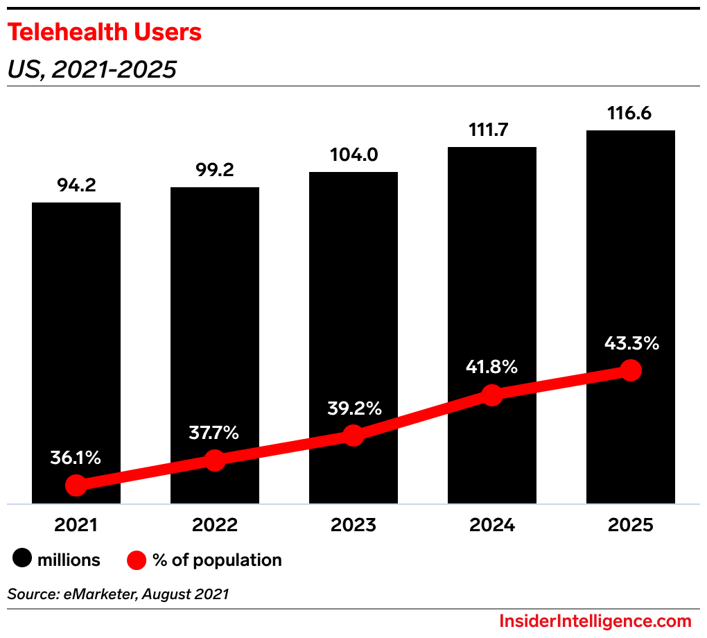 - Telehealth users in the US are expected to top 116.6 million (43.3% of the US population) by 2025—which is up from this year’s 94.2 million (36.1% of the US population), according to our forecast.