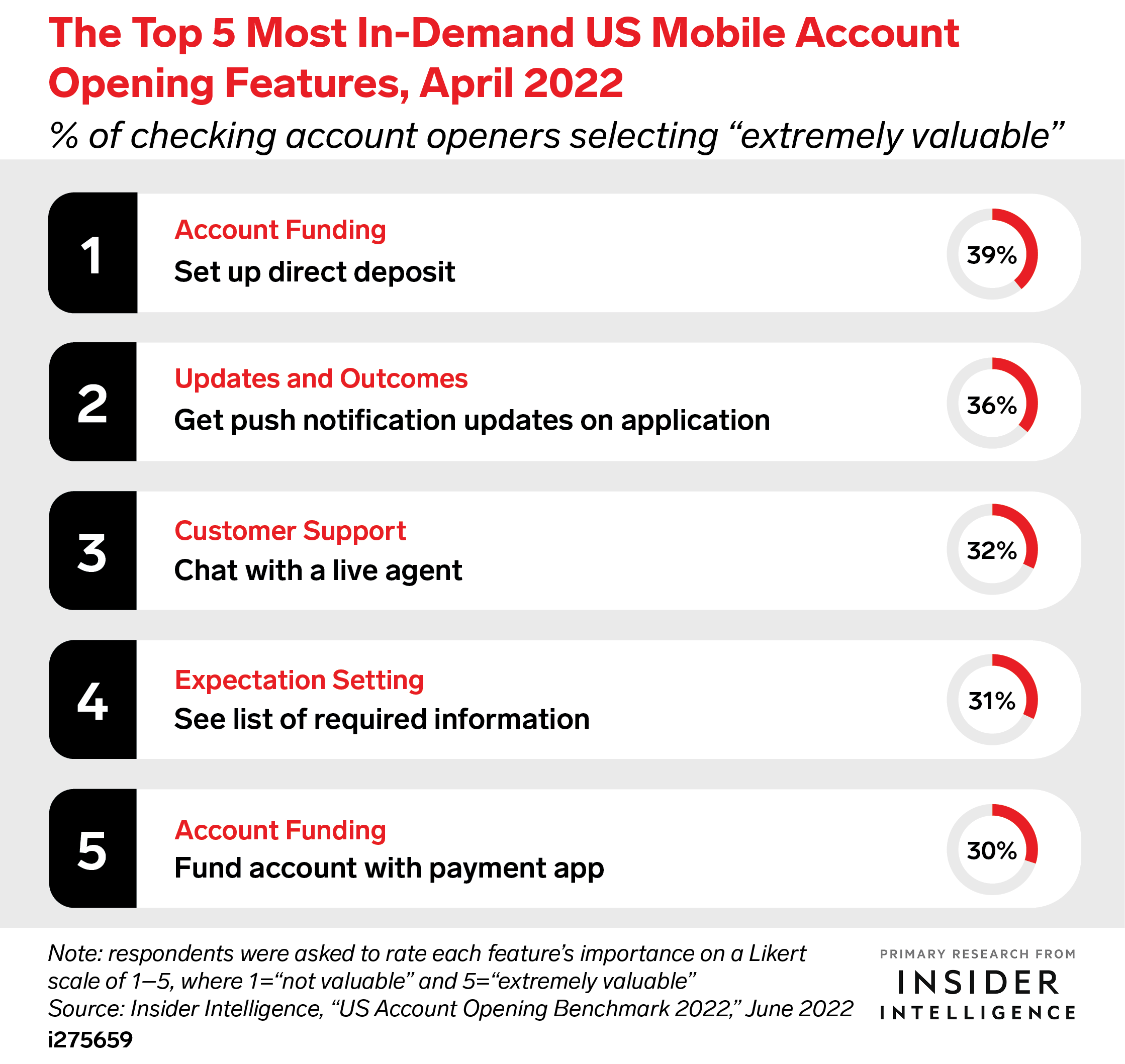 KEY STAT: Funding a new checking account is top of mind for consumers, with two of the five most in-demand features falling into the category. Nearly 40% of US checking account openers called setting up direct deposit “extremely valuable,” while 30% said the same of using a payment app to make a first deposit.