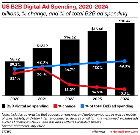 B2B digital ad spending continues to grow in 2022, albeit at a slower pace than in previous years. This year sees a return to more stable growth after marketers rushed to increase digital ad budgets during the early phase of the pandemic.