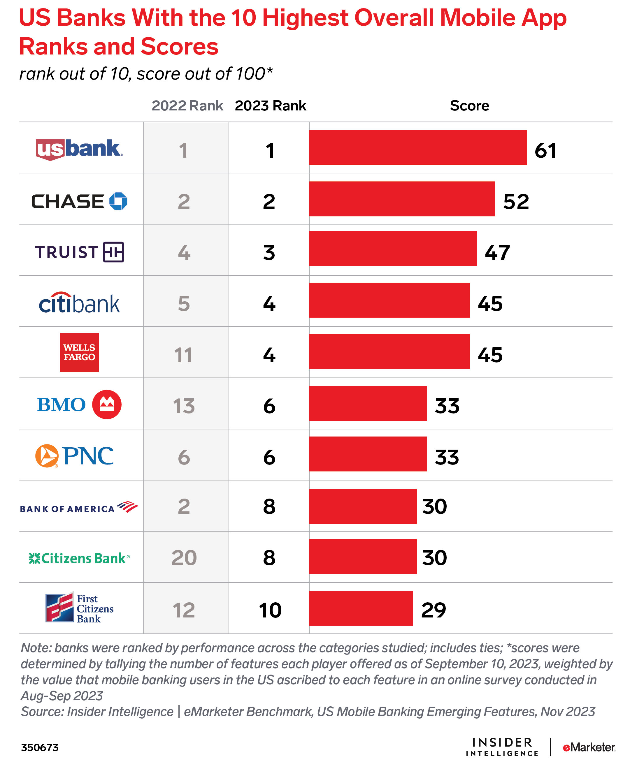 The news: Last year, our “US Mobile Banking Emerging Features Benchmark” concluded that U.S. Bank is best at meeting the demand for innovative mobile banking features. And Javelin’s 2024 Mobile Banking Scorecard recently confirmed U.S. Bank’s mobile banking app still beats competitors’.