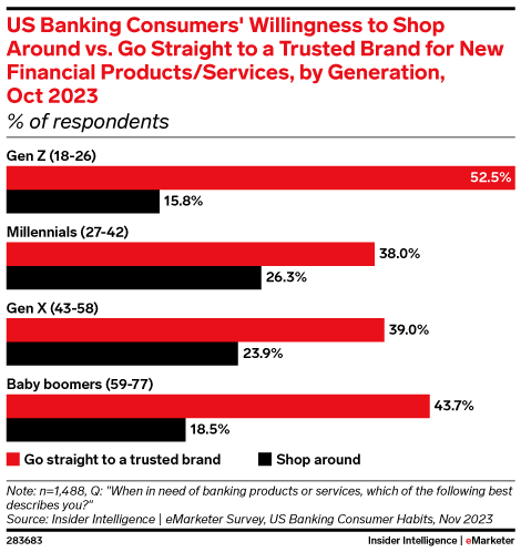 KEY STAT: Over half (52.5%) of Gen Zers would go straight to a trusted brand when choosing a new banking product or service, while only 15.8% would shop around. First impressions early in the customer journey will be key to winning these younger customers.