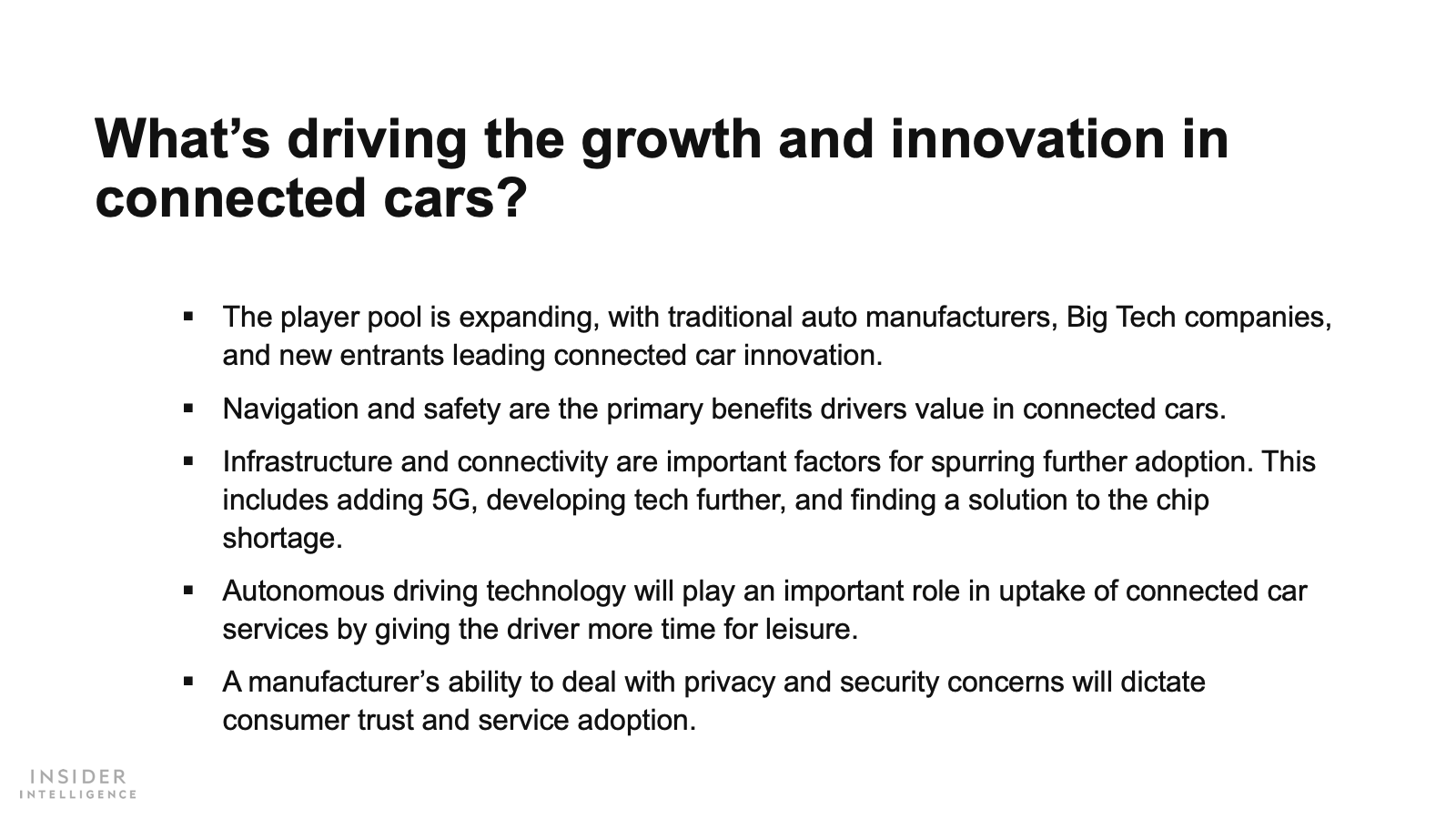 WHAT’S IN THIS REPORT? This report examines our forecasts for connected car drivers in the US, looks at underlying trends that are driving connected car adoption, and discusses how players can take advantage of emerging opportunities.
