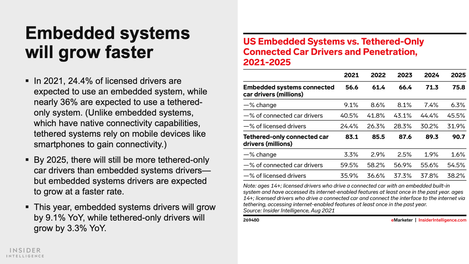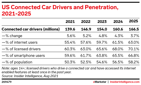 In 2021, 60.3% of licensed drivers in the US will drive a connected vehicle, expanding to 70.1% by 2025. Although new vehicle growth may be impeded in the short term by the semiconductor chip shortage, many opportunities exist with cars already on the road.