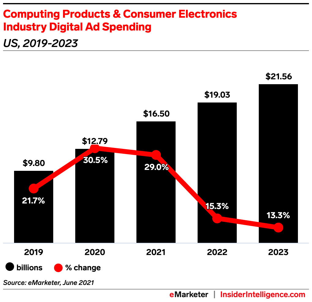 Looking ahead: We expect sustained growth in 2021, although the category will fall behind consumer packaged goods (CPG), retail, and entertainment. Though digital ad spending in the computing products and consumer electronics sector will begin slowing this year, it will maintain double-digit growth for at least the next few years, with a 13.3% rise in 2023.