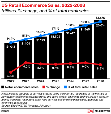 US retail sales will grow at a modest and stable pace through 2028, with ecommerce progressing more than four times faster than in-store sales. Major retailers are returning to online sales growth after a tumultuous period of post-pandemic adjustment. Gen Z consumers and product category trends present key opportunities for growth in digital commerce.