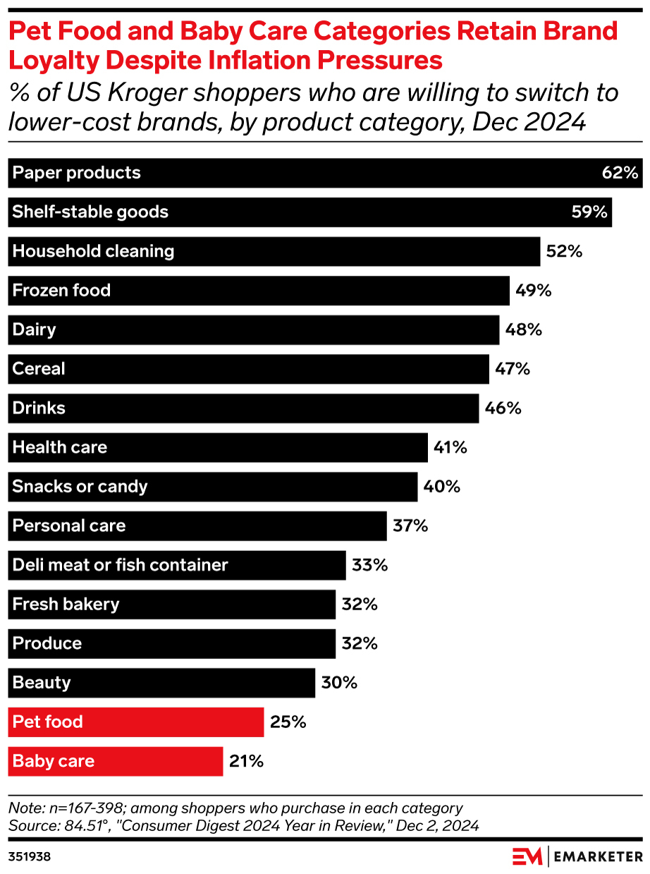- Still, the shift isn’t evenly distributed across categories. While a significant share of consumers are far more willing to trade down in areas such as paper goods (62%) and shelf-stable products (59%), most are reluctant to do so when it comes to beauty (30%), pet food (25%), or baby care (21%).