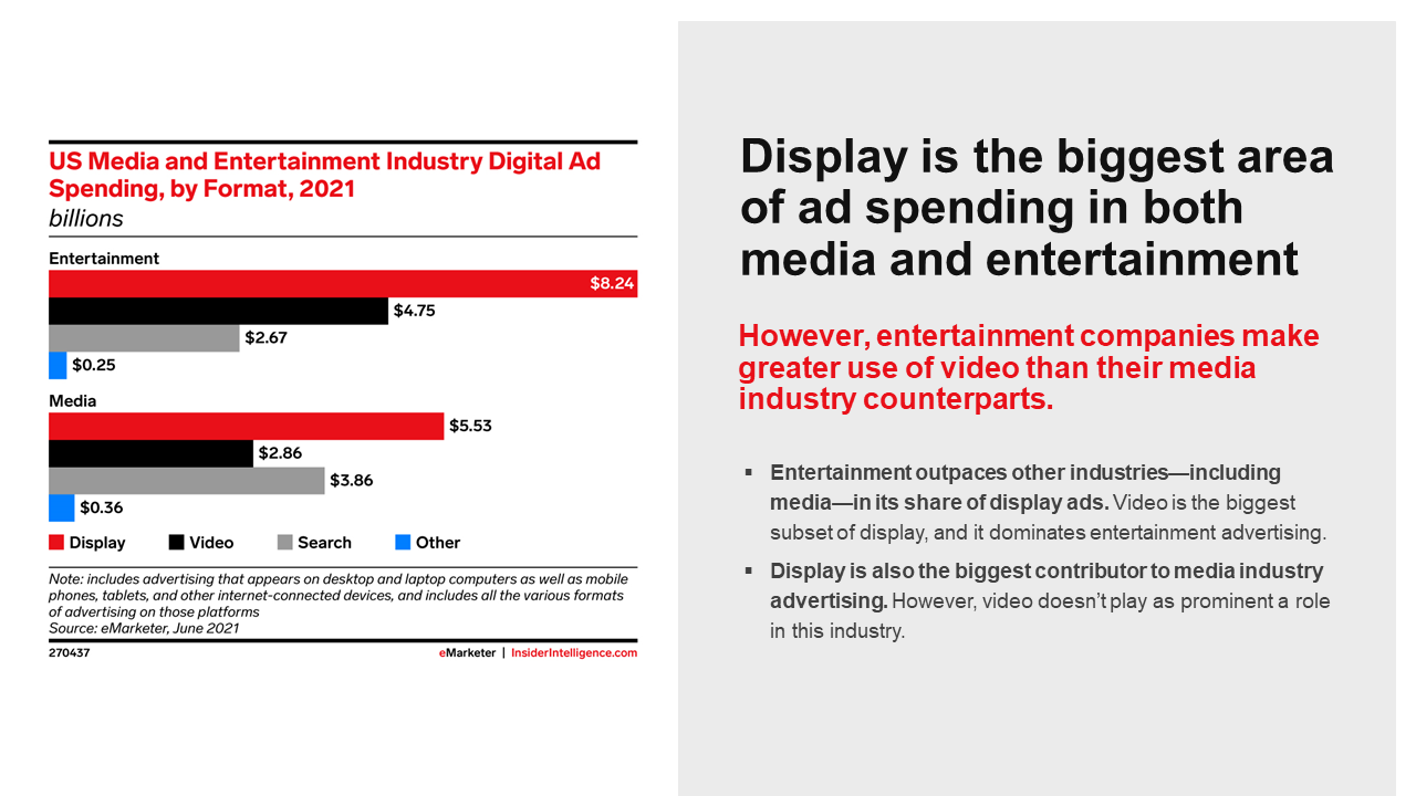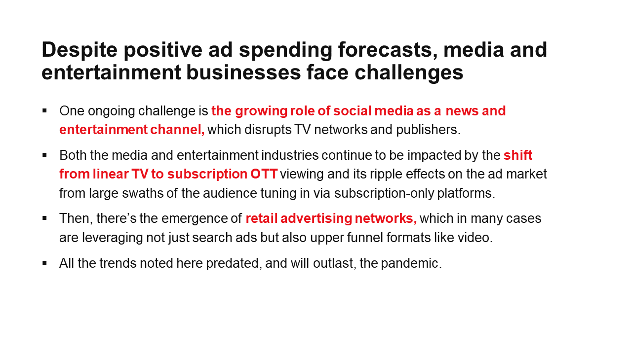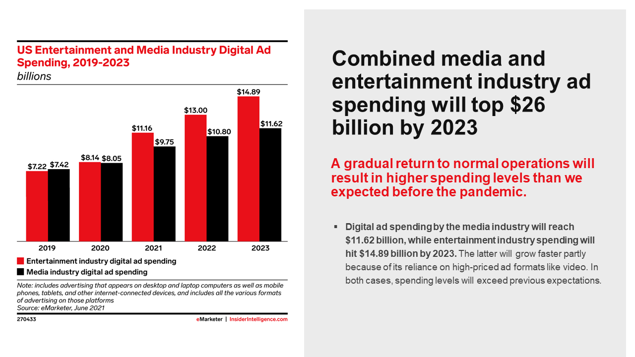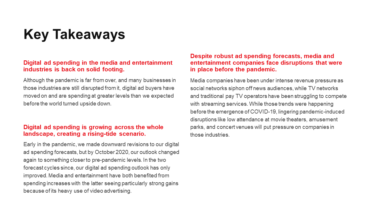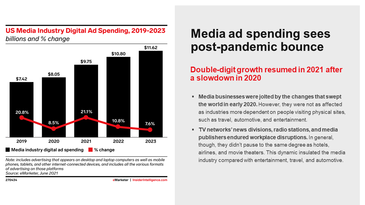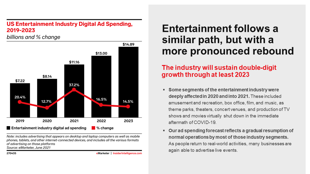 The gradual reopening of TV production and live entertainment has given companies in those industries impetus to resume digital ad spending at levels surpassing what we expected even before the pandemic. That means media and entertainment have essentially overcome the negative effects of COVID-19, even as some business continues to feel aftershocks of the public health crisis.