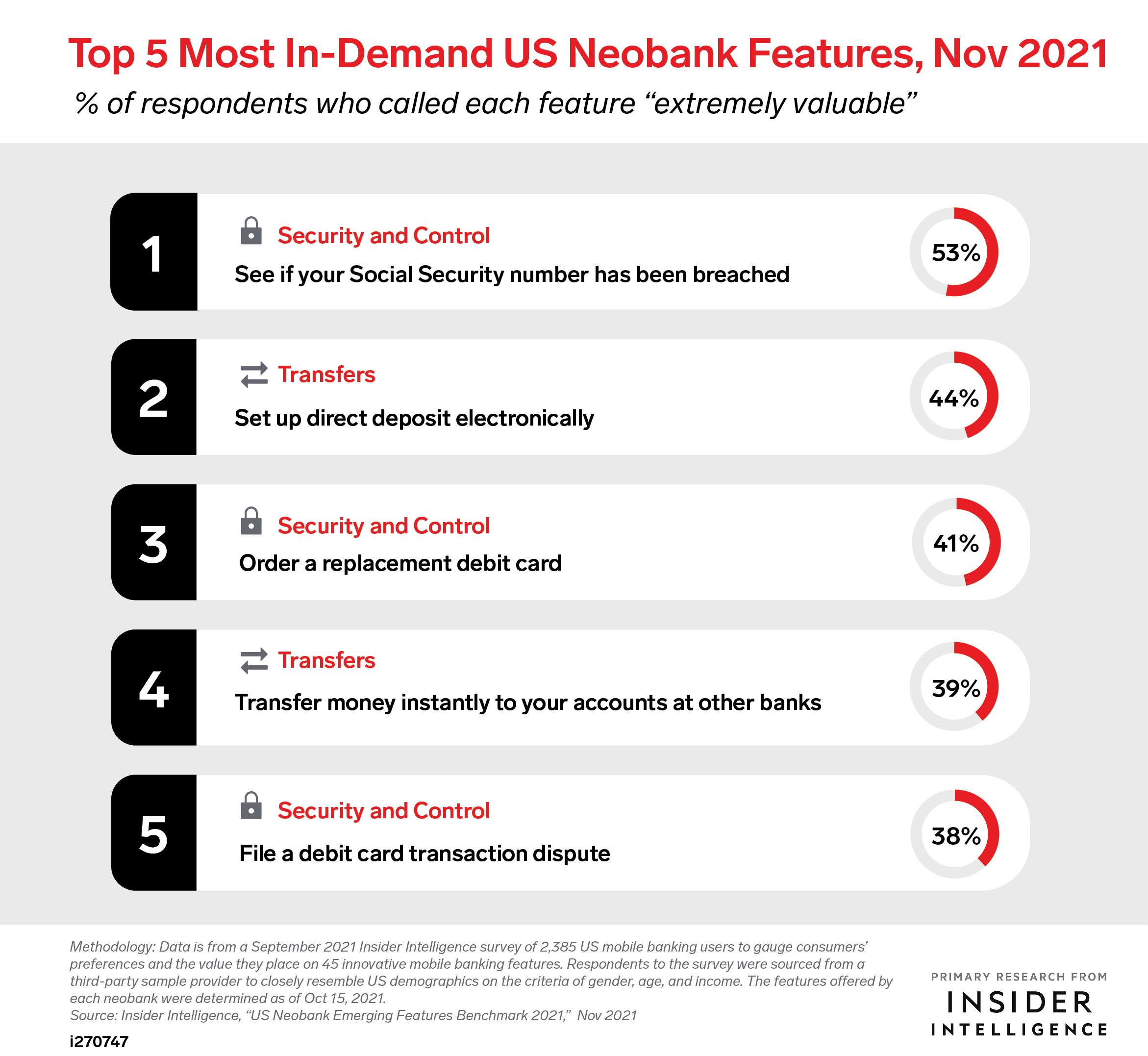 KEY STAT: Three of the five most valuable features among the US mobile banking users we surveyed in September 2021 fall under the Security and Control category, underscoring the critical need for banks to offer safety-related tools.