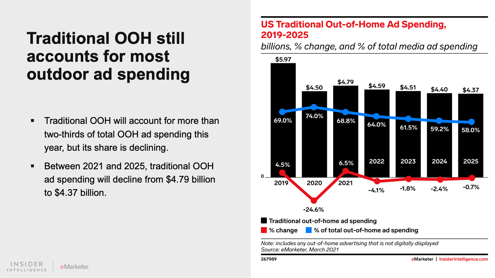 WHAT’S IN THIS REPORT? This report examines trends, data, and strategies related to how marketers are approaching US OOH advertising. It includes our latest forecasts for total OOH ad spending, digital OOH, traditional OOH, and programmatic OOH ad spending.