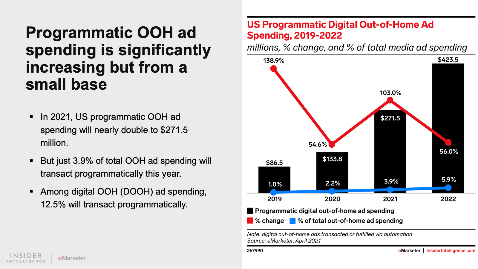 Just 3.9% of total OOH ad spending will be transacted or fulfilled programmatically this year. But programmatic is a subset of digital outdoor advertising, and when viewed in that light, programmatic will account for 12.5% of DOOH ad spending in 2021 and 16.4% in 2022.