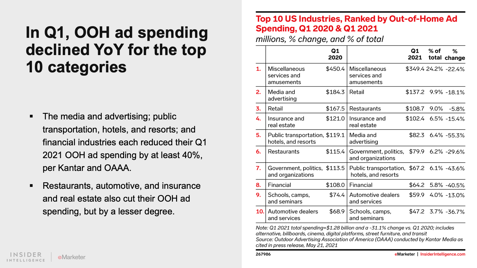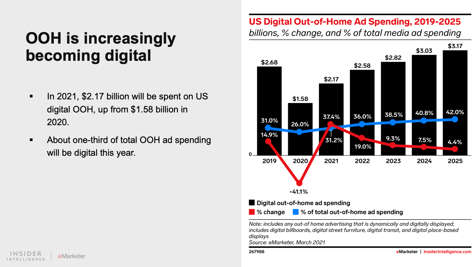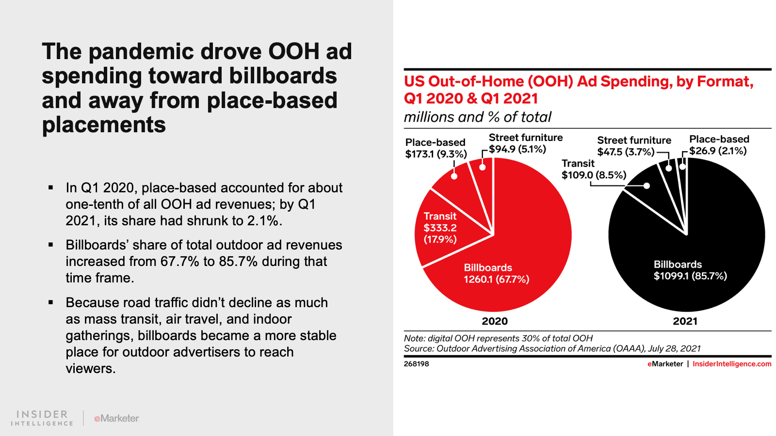 In 2020, out-of-home (OOH) advertising was acutely affected by the pandemic. Advertising dollars are coming back to OOH this year, but they’re unevenly distributed among outdoor ad formats. The outdoor industry is also undergoing a technological change that will alter the way advertisers plan and buy OOH.