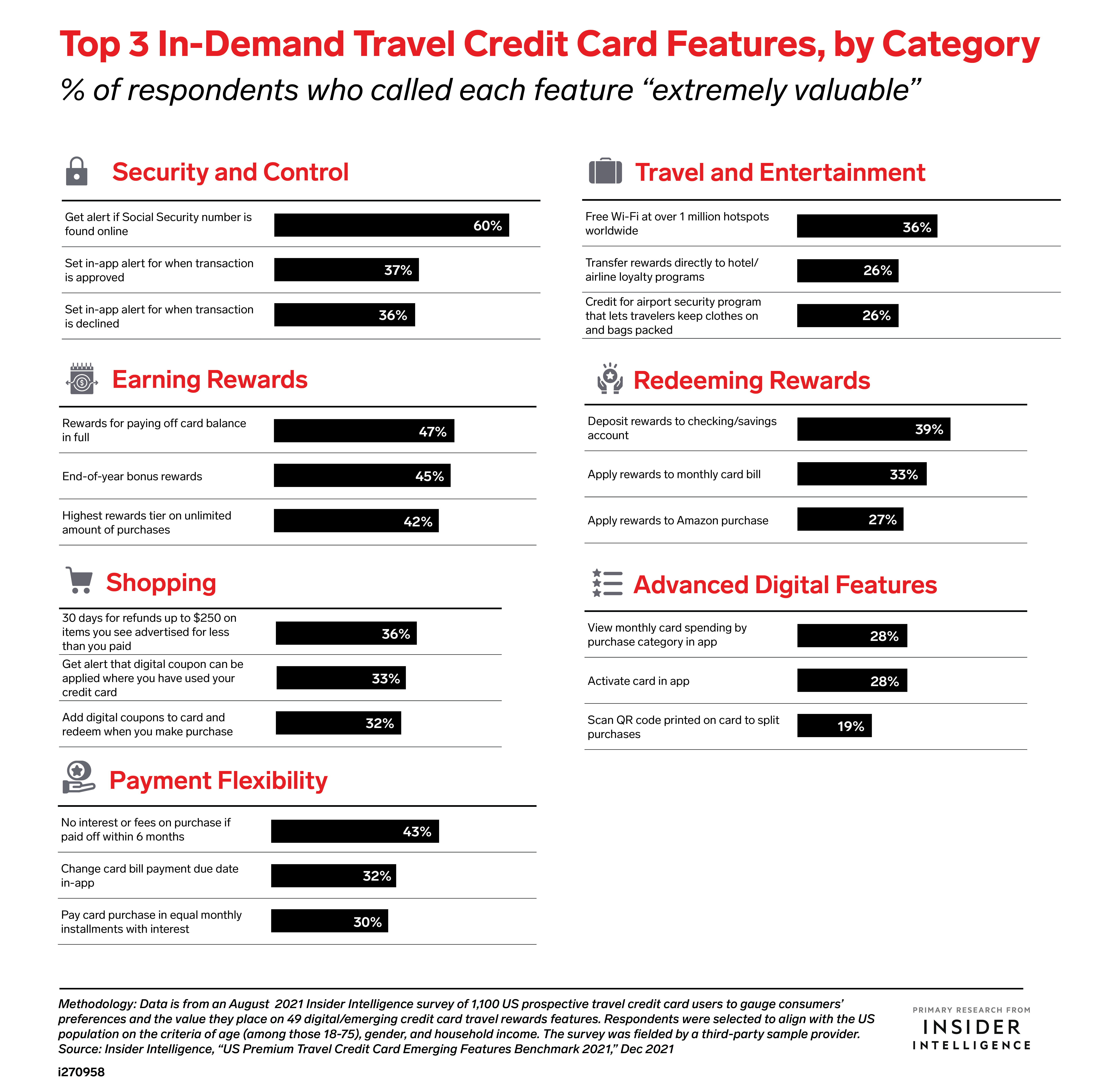KEYSTAT: Of the 49 travel credit card features included in our study, various ways to earn rewards placed in three spots among the top five travel credit card features. The other top features fell under Security and Control (first place) and Payment Flexibility (fourth).