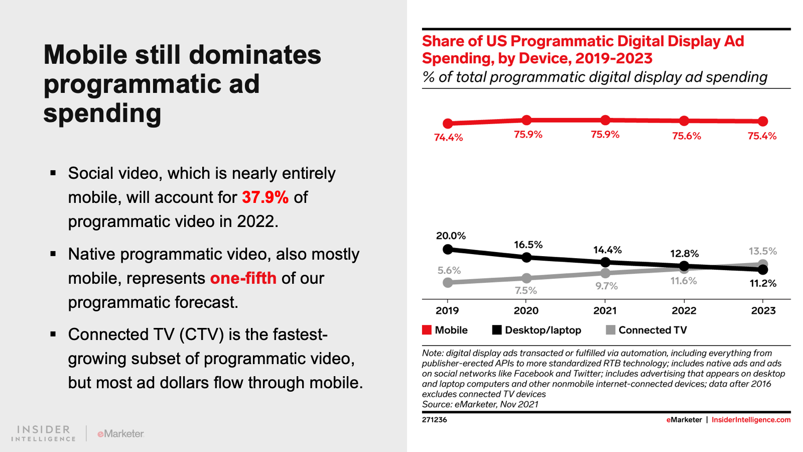 Mobile represents two-thirds of programmatic video advertising, but its share is declining as connected TV (CTV) earns more ad dollars.
